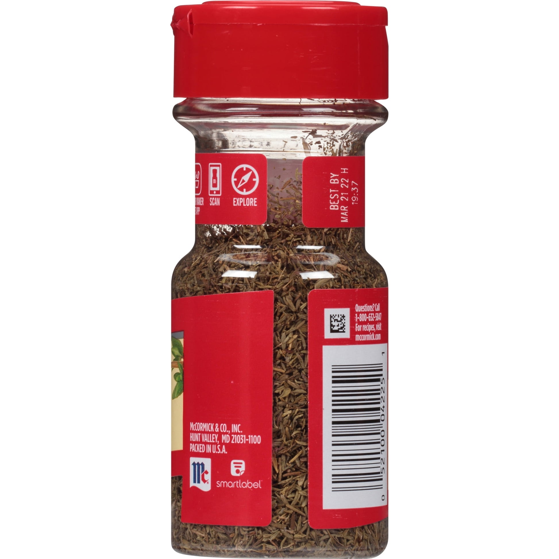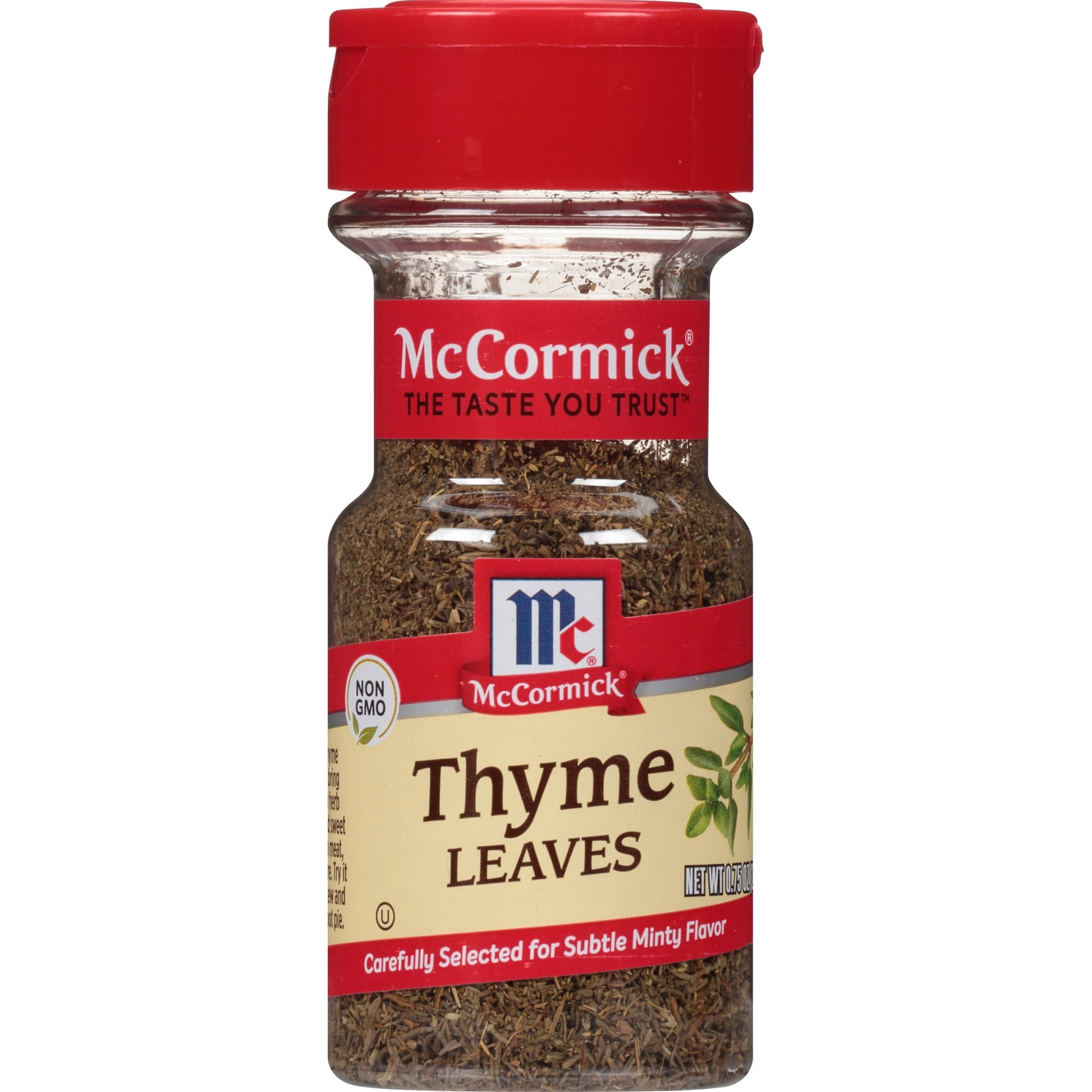 One of our more popular herbs, McCormick Thyme Leaves bring mellow herb flavor and sweet aroma to meat, fish and more. Excellent for everyday cooking, it elevates beef stew, chicken pot pie, casseroles, roasted potatoes or vegetables and meatless dishes with a warm and inviting taste.We carefully harvest and dry our thyme leaves so that they retain their rich color, piney aroma and subtle minty flavor. The robust leaves can withstand long cooking times in dishes like stews, gumbos and tomato sauces or high heat cooking for roasted or grilled meats. Thyme blends well with other herbs and spices, making it often-used around the world in seasoning blends including French Herbes de Provence, Caribbean jerk spice and Middle Eastern za’atar. This McCormick® Whole Thyme Leaves is in a Plastic bottle that is 0.75 ounces. Store this shelf-stable item at an ambient temperature.