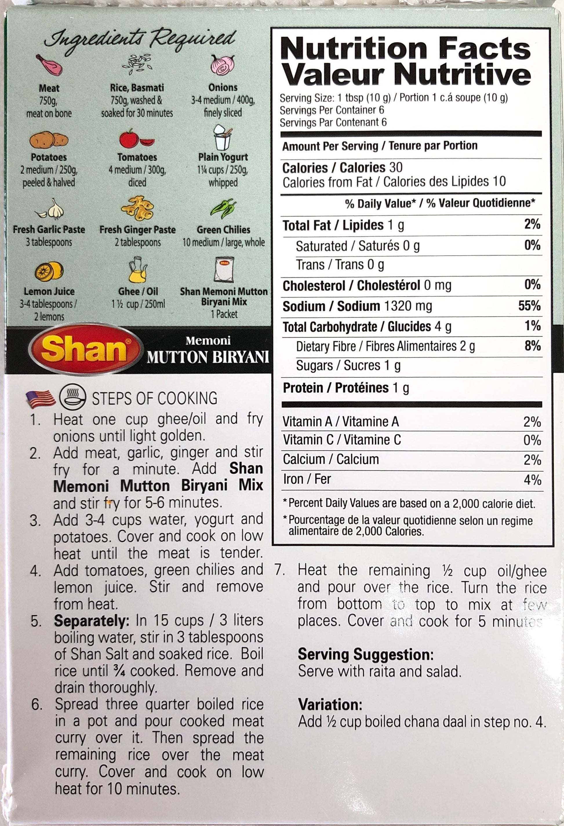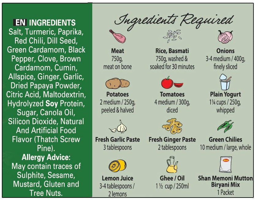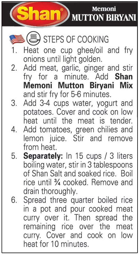 Shan Memoni Mutton Biryani Mix with its classic blend of rich and aromatic spices imparts the perfect flavour to beef and helps you recreate the true Biryani flavour.