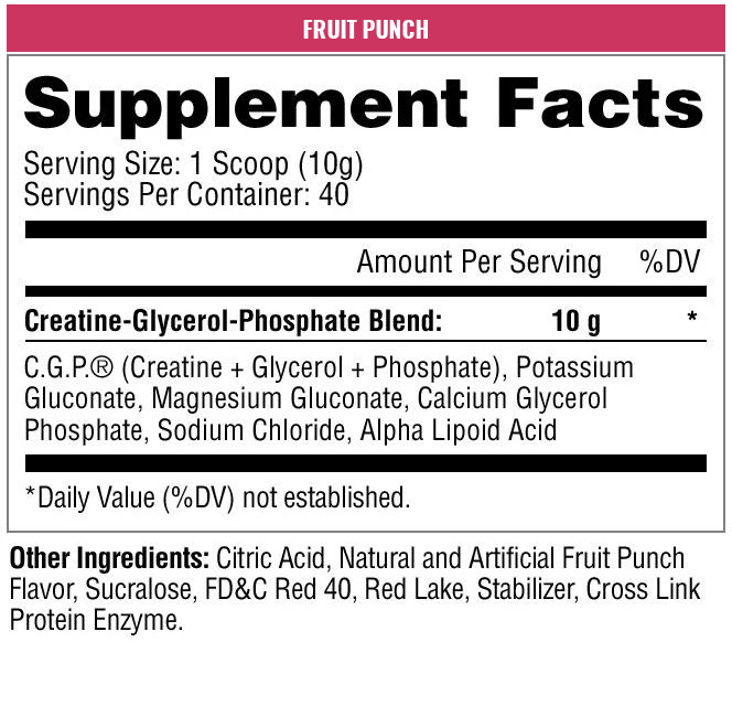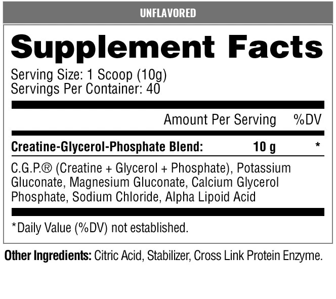 The unique phosphate-bonded creatine in C.G.P. has an unparalleled advantage in its delivery by using an additional glycerol bond to facilitate rapid absorption. C.G.P. delivers a high energy boost to your ATP supply to help delay fatigue and maximize strength development.*