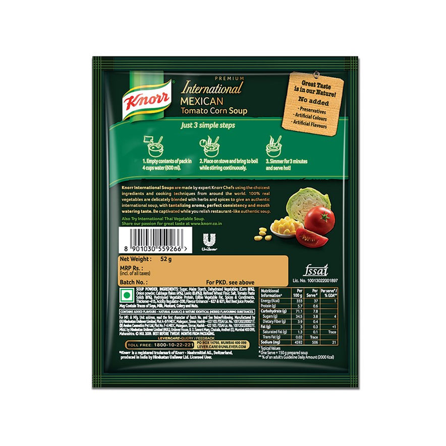 We bring the world of flavours to your home with our authentic Knorr Mexican Tomato Corn Soup. Knorr has hand-picked the best quality vegetables and mixed it with spices to make delicious Knorr Mexican Tomato Corn Soup. A flavoursome mix of corn, leeks, garlic, black pepper and tomatoes gives it its tantalizing aroma, mouth-watering taste and perfect consistency. Made with 100 percent real vegetables and no added preservatives, this soup is ready in three simple steps and serves four. So now enjoy Restaurant like delicious Soup at home.Knorr Soups range comprises of 11 delicious flavours of 4 serve soups and 7 flavours of Cup-a-soup. Great taste is in our Nature! Knorr has gone to great lengths to ensure a perfect blend of ingredients and consistency that give you Restaurant like Soup at home.About Knorr: Just like you, we love everything about food, because no delicious meal is cooked without love. Love for carefully selected ingredients, flavours and spices, or the aroma of dinner wafting through your home. Love for the people you feed everyday; your family and friends, relatives and guests, the people that matter to you the most. With Knorr as your cooking partner, you can serve your loved ones nutritious and flavourful meals at home. Soup Fun Fact - Soup isn’t always served hot. In warmer climates like Spain, cold soup alternatives, like tomato-based gazpacho, are popular.