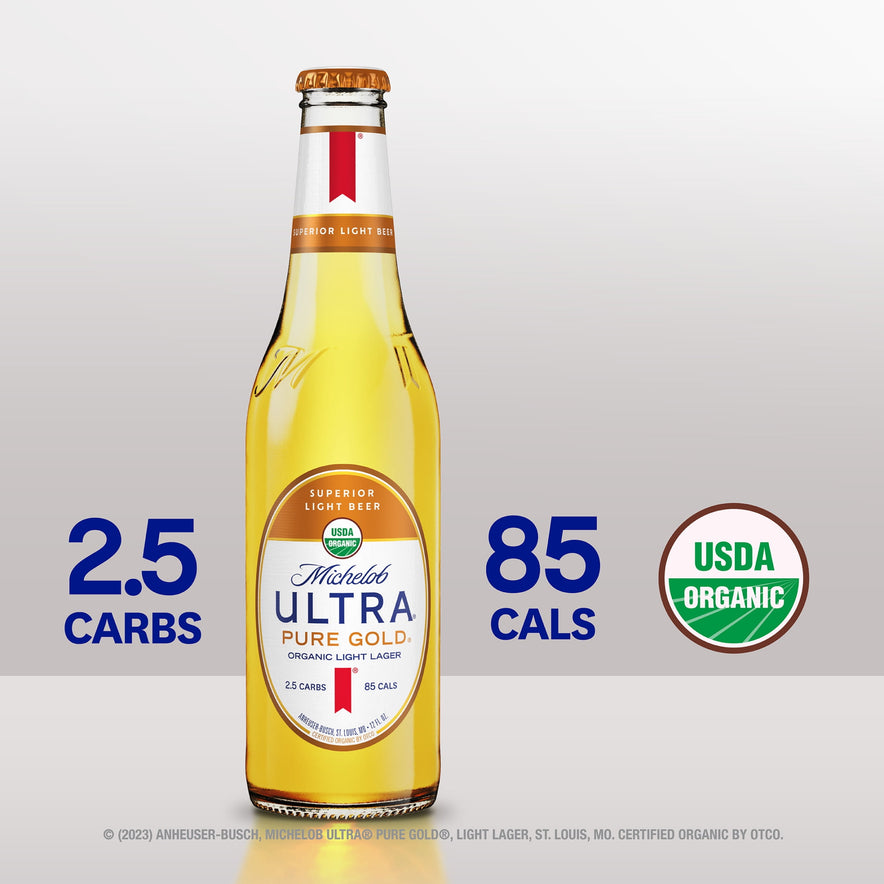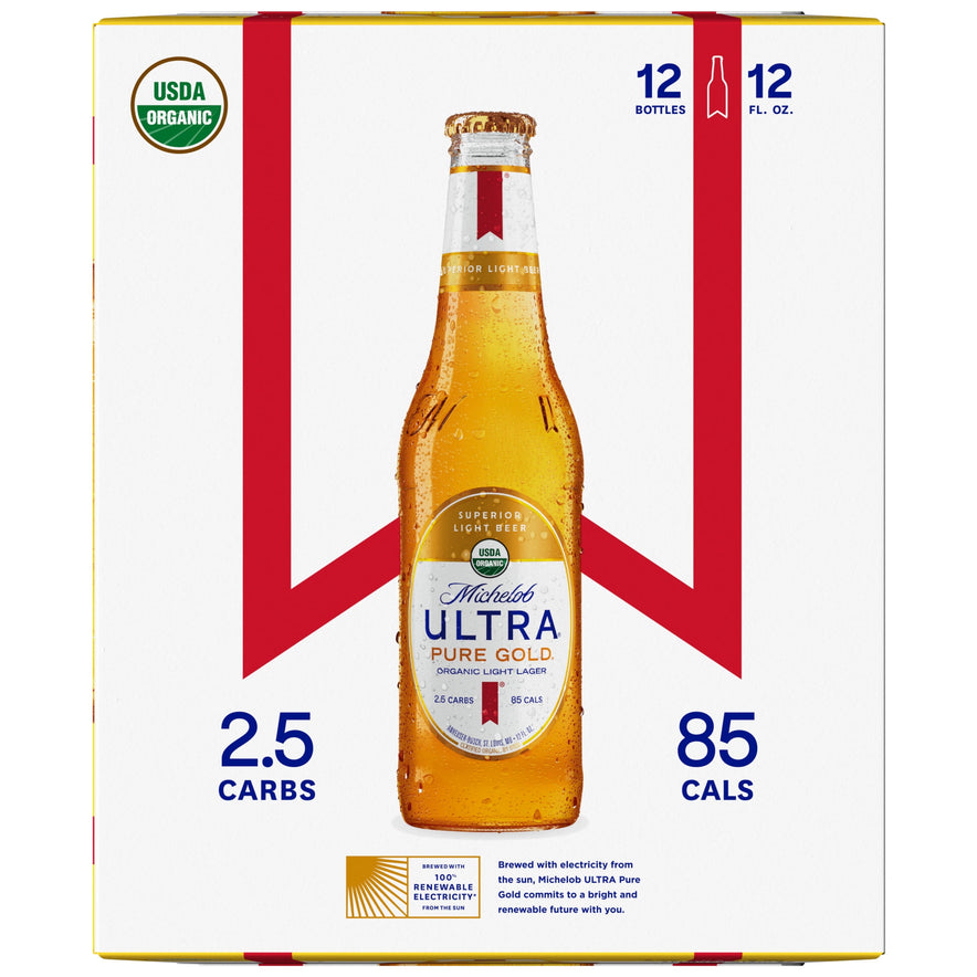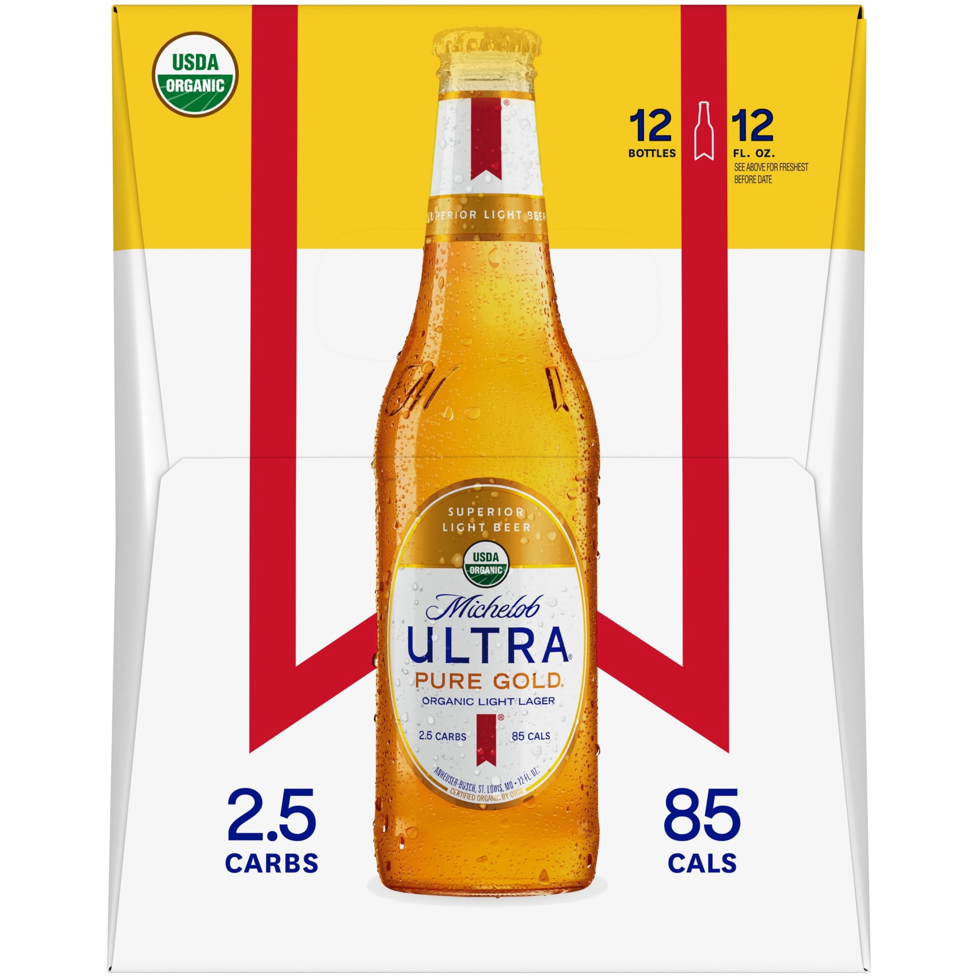 Michelob ULTRA Pure Gold Organic Light Lager is an organic beer made with ingredients from the country's finest fields. This light beer is brewed with organic grains, triple filtered and brewed free of artificial colors and flavors, giving it a pure and refreshing taste. Michelob ULTRA Pure Gold is an organic alcohol and low carb beer that contains 2.5 grams of carbs and 85 calories per serving. Enjoy Pure Gold anytime the occasion calls for a refreshing beverage; this light lager is perfect for enjoying with dinner or sipping on during get-togethers. Taking this twelve pack of bottled beer with you anywhere is simple with the easy to use handle and case.