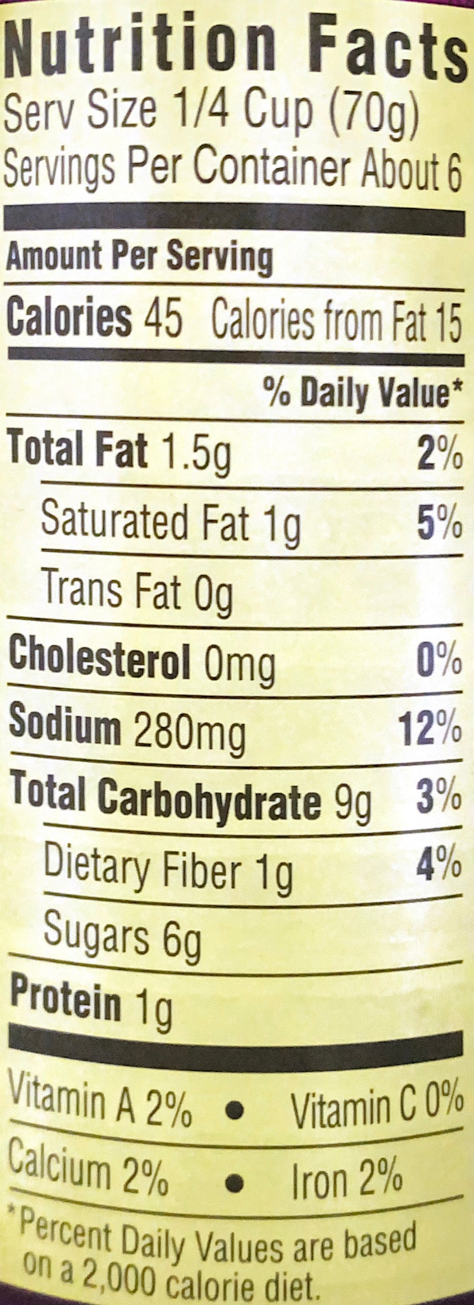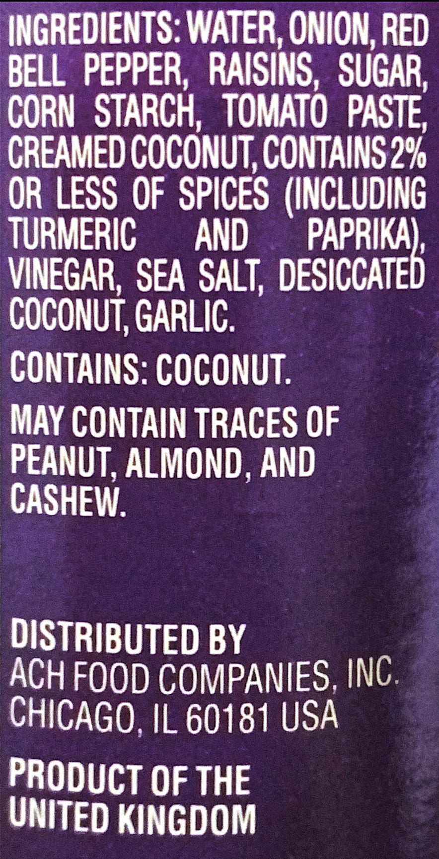 INGREDIENTS: WATER, RED BELL PEPPERS, RAISINS, ONION, SUGAR, FOOD STARCH-MODIFIED, TOMATO PASTE, COCONUT PASTE, CONTAINS 2% OR LESS OF SPICES (INCLUDING PAPRIKA AND TURMERIC), SALT, DESICCATED COCONUT, LACTIC ACID, GARLIC.