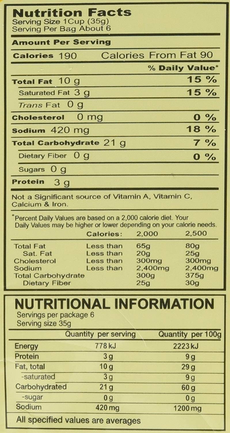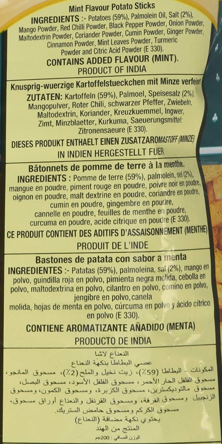 Ingredients: Potatoes (54%), Peanut Oil, Salt, Spices and Condiments, Black Pepper, Dried Mint Leaves (1%), Powdered Mangoes, Dried Red Chillies.
