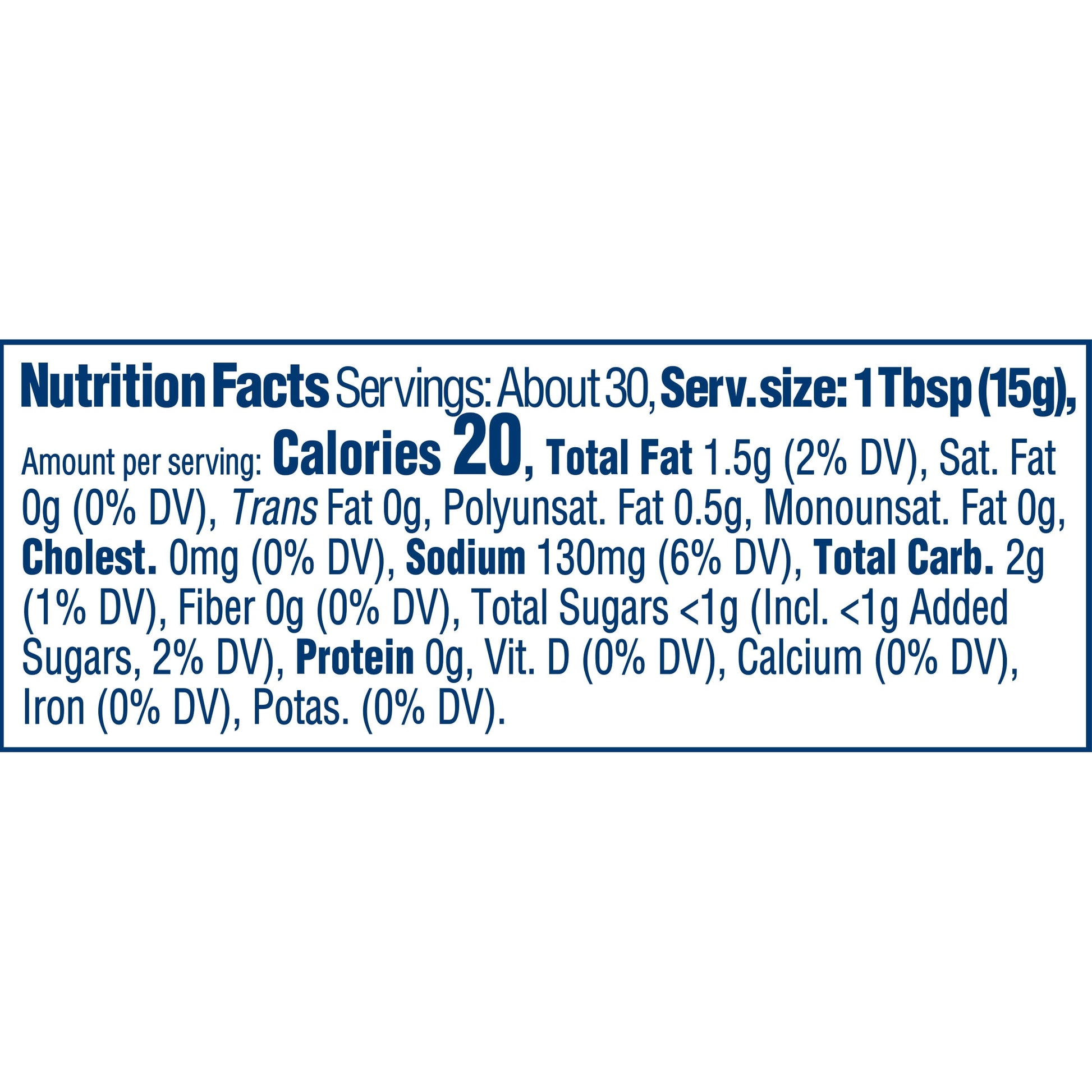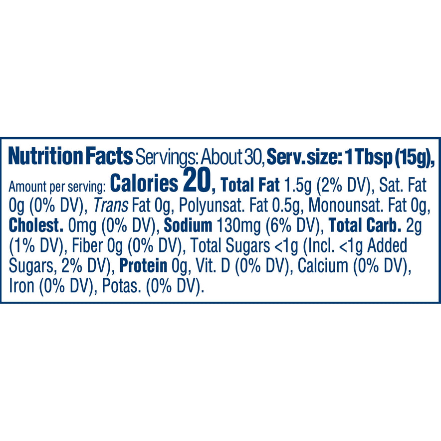 Miracle Whip Light Mayo-like Dressing adds a cool, zesty flavor to almost anything. Bursting with tangy vinegar and a medley of spices, our family favorite dressing and condiment delivers creamy texture and delicious flavor in every bite. As a spread similar-tasting to mayonnaise, light Miracle Whip is known for kicking sandwiches up a notch. Try out this versatile ingredient that can be used to make tangy salad dressings and even chocolate cakes for a finger-licking adventure. Our Light Miracle Whip contains fewer calories and fat than Kraft Mayonnaise. This product contains 20 calories and 1.5g fat per serving, Kraft Mayonnaise contains 90 calories and 10g fat per serving. Try light Miracle Whip for sandwiches and salads, in your favorite chicken recipe or as a creamy burger sauce. It also makes a tasty secret ingredient in deviled eggs and potato salad. Each jar should be stored in the refrigerator after opening.