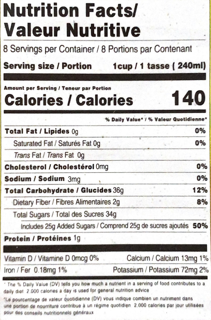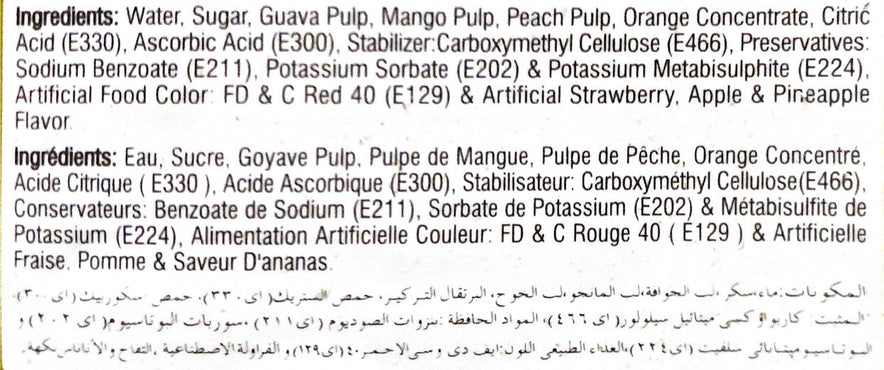 Water, Sugar, Guava Pulp, Mango Pulp, Peach Pulp, Orange Concentrate, Apple Concentrate, Pineapple Concentrate, Pomegranate Concentrate, Citric Acid (E330), Ascorbic Acid (E300), Stabilizer: Carboxymethyl Cellulose (E466), Preservatives: Sodium Benzoate (E211), Potassium Sorbate (E202) & Potassium Metabisulphite (E224), Artificial Food Color: FD & C Red No. 40 (E129).