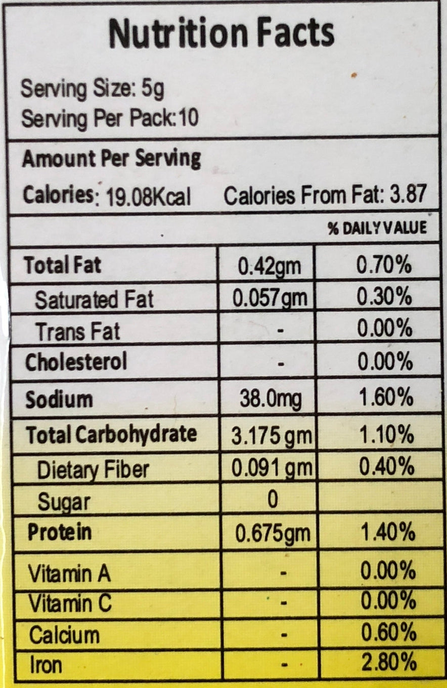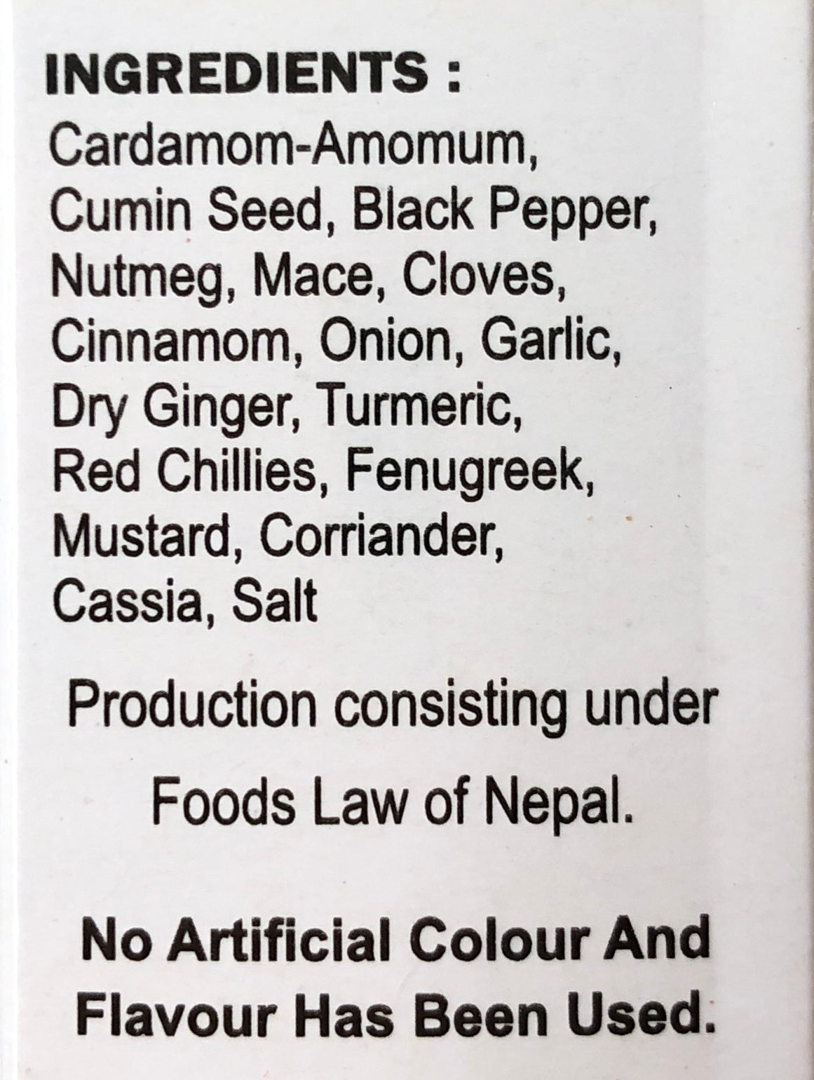 Ingredients: cardamom-amomum, cumin seed, black pepper, nutmeg, mace, cloves, cinnamon, onion, garlic, dry ginger, turmeric, red chilies, fenugreek, mustard, coriander, cassia and salt.