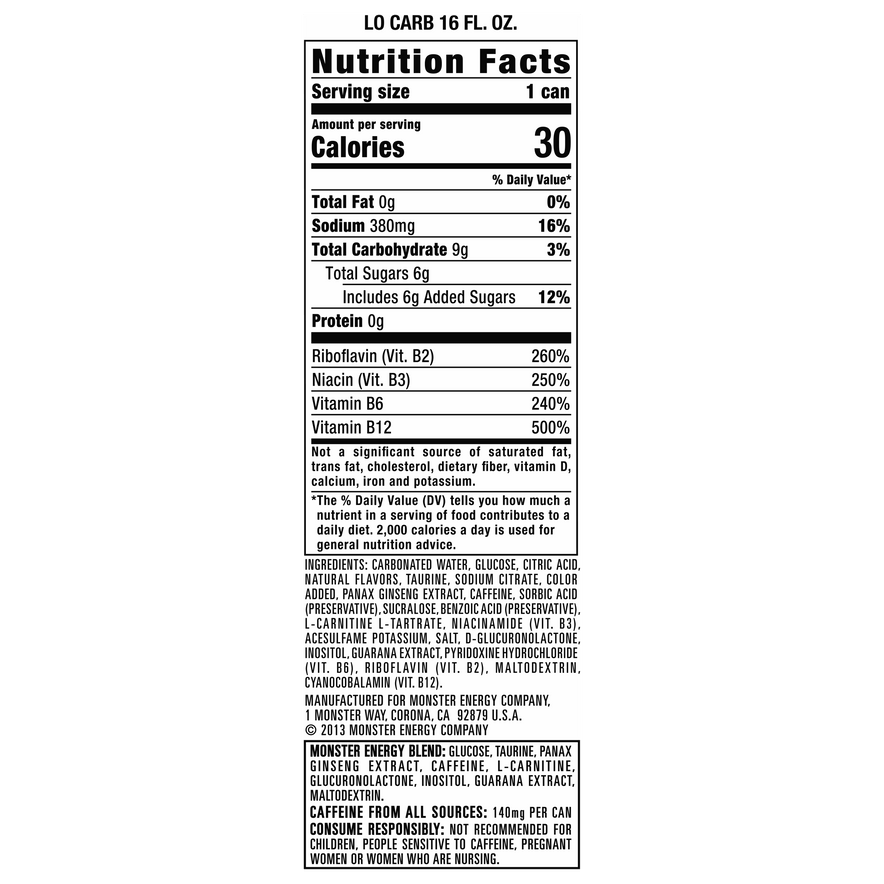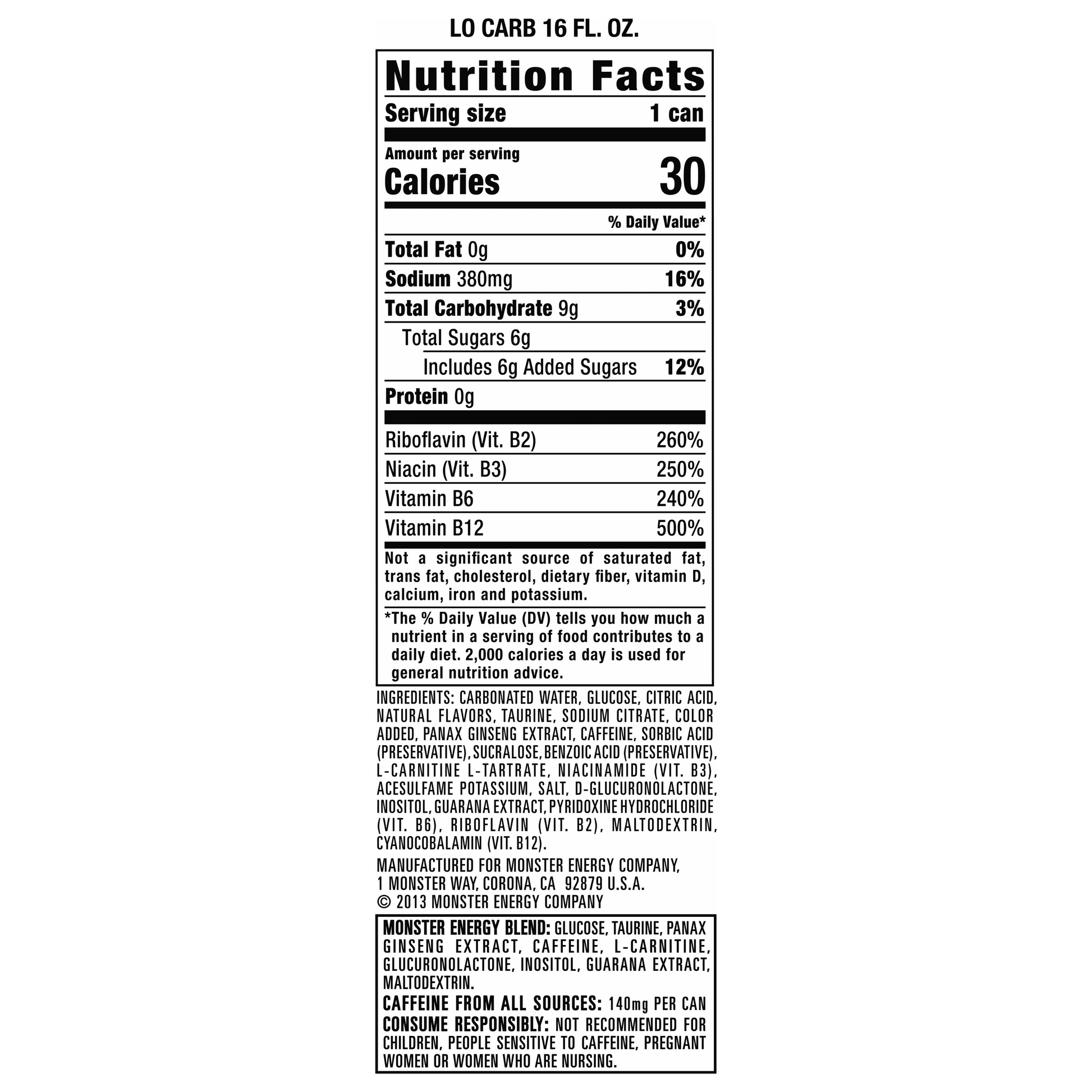 This Lo-Carb Monster Energy Drink brings you a healthier option for getting the energy that you crave. With lower carbs and calories than the original, you can enjoy this fresh option anytime you need a boost. The Lo Carb energy drink comes in a convenient 16 fl oz size, so you get just the right amount to keep moving. This beverage still delivers twice the buzz of a regular energy drink, but only has a fraction of the calories. The regular energy drink has a bold flavor. It contains classic energy drink ingredients including L-carnitine, taurine and ginseng. The drink also has B vitamins, offering you an ideal way to get a healthy push. It is shelf stable so you can even store it in your pantry until you are ready to drink it.