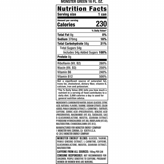 UNLEASH THE BEAST: Tear into a can of the meanest energy drink on the planet, Monster Energy. Athletes, musicians, anarchists, co-ed’s, road warriors, metalheads, geeks, hipsters, and bikers dig it- you will too SMOOTH & EASY FLAVOR: Monster packs a powerful punch, but has a smooth easy drinking flavor. What does it taste like? It tastes like Monster BIG BAD BUZZ: With 160mg of Caffeine in a “Monster” 16 ounce can, Monster Energy offers more for less when compared with other 8.3 ounce energy drinks. Monster Original Green, 16 Fl Oz Can.