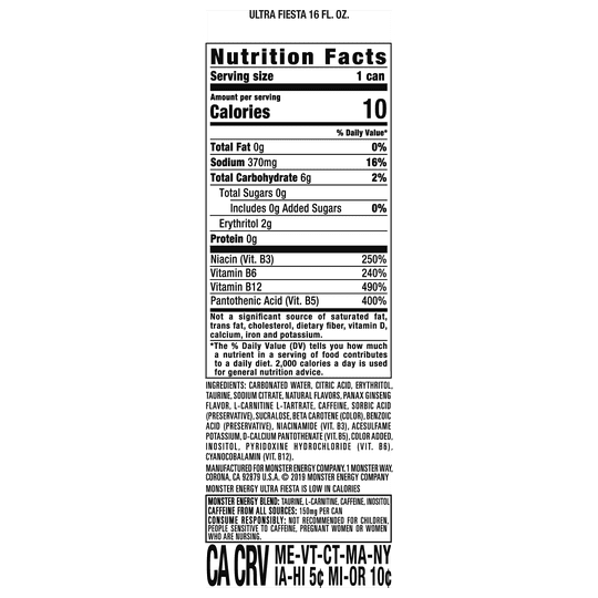 FULL FLAVOR, ZERO SUGAR - Monster Energy Ultra Fiesta has 10 calories and zero sugar but with all the flavor you’re accustomed to and packed with our sugar-free Monster Energy blend