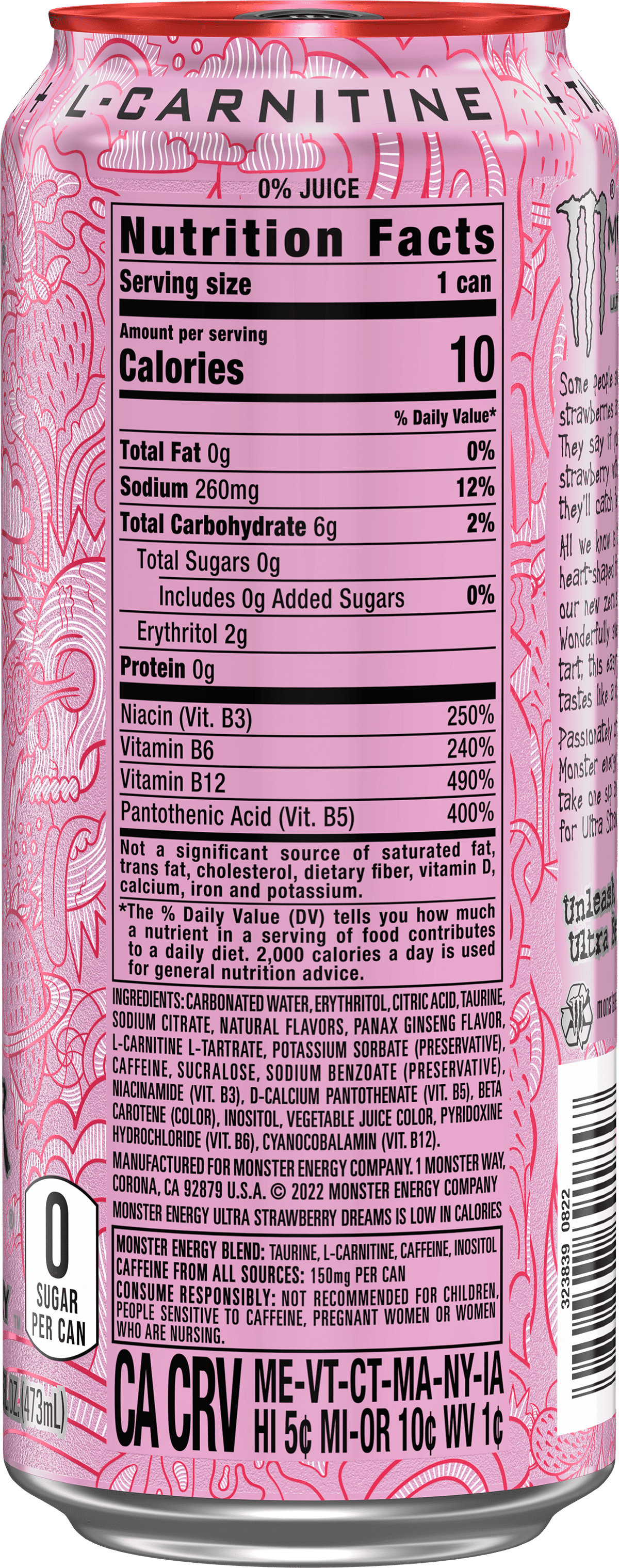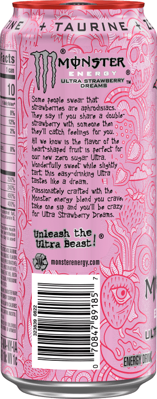 Some people swear that strawberries are aphrodisiacs. They say if you share a double-strawberry with someone then they’ll catch feelings for you. All we know is the heart-shaped fruit makes the perfect flavor for our new zero sugar Ultra. Wonderfully sweet while slightly tart, this easy-drinking Ultra tastes like a dream. Passionately crafted with the Monster energy blend you crave; take one sip and you’ll be crazy for Ultra Strawberry Dreams.