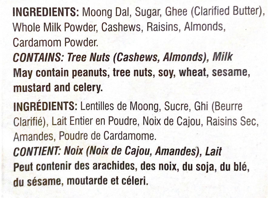 Ingredients:Â Moong Dal, Sugar, Ghee (Clarified Butter), Whole Milk Powder, Cashews, Raisins, Almonds, Cardamom Powder.
