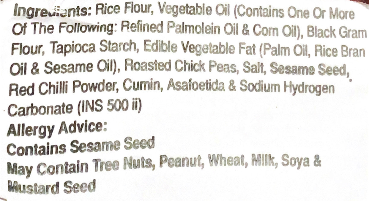 Ingredients: Rice Flour, Chickpea Flour, Vegetable Oil, Salt, Ajwain, Sesame Seeds, Black Pepper and Red Peppers.