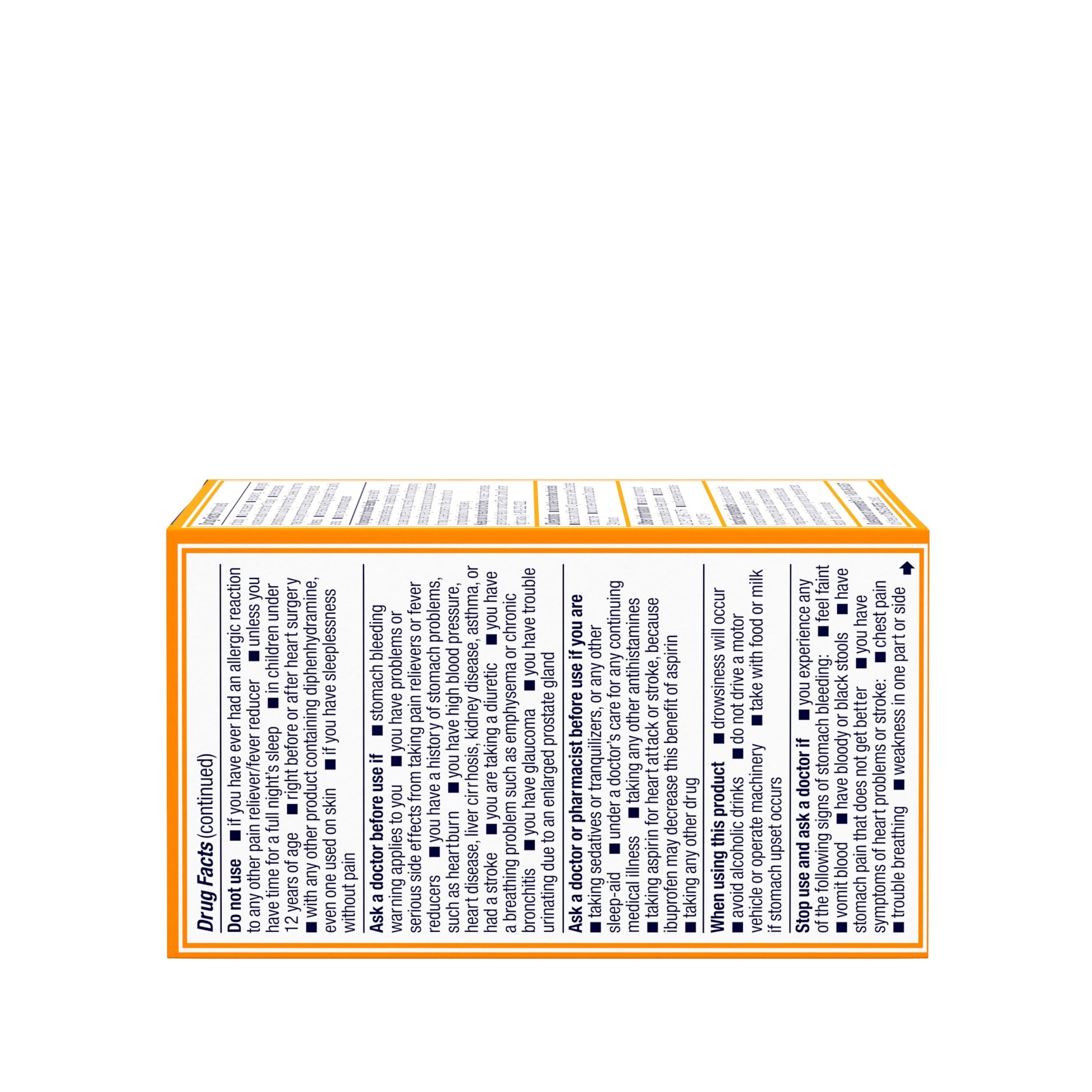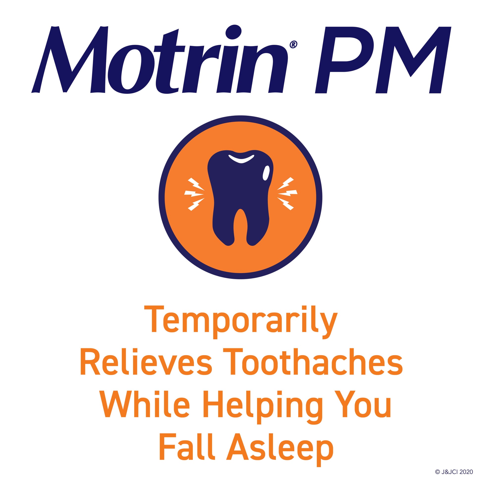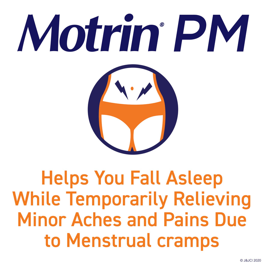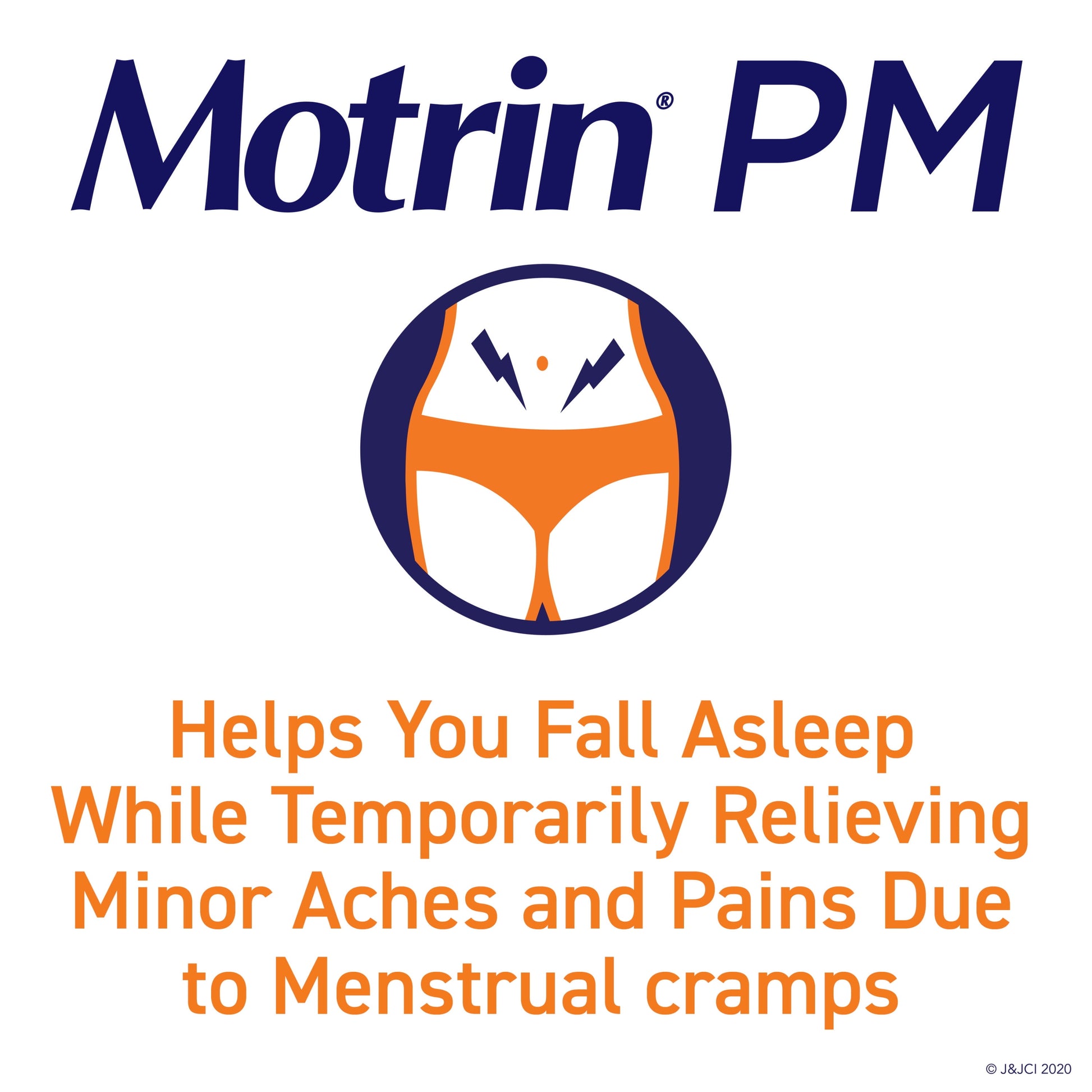 Ease today's aches and get the sleep you need for tomorrow with Motrin PM caplets. Motrin PM provides relief from occasional sleeplessness when associated with minor aches and pains. Combining 200 milligrams of ibuprofen with 38 milligrams of diphenhydramine citrate, Motrin PM provides pain relief with a nighttime sleep-aid to help you fall asleep. This site contains current product information and may differ from the information on the product packaging you may have.