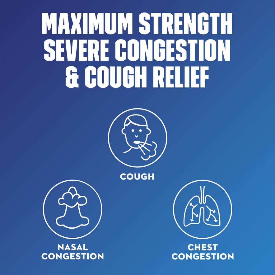 COUGH COLD AND FLU MEDICINES FOR ADULTS: Maximum Strength Mucinex® Fast Max Severe Congestion & Cough provides powerful multi-symptom relief for your worst symptoms including cough, chest congestion, and nasal congestion