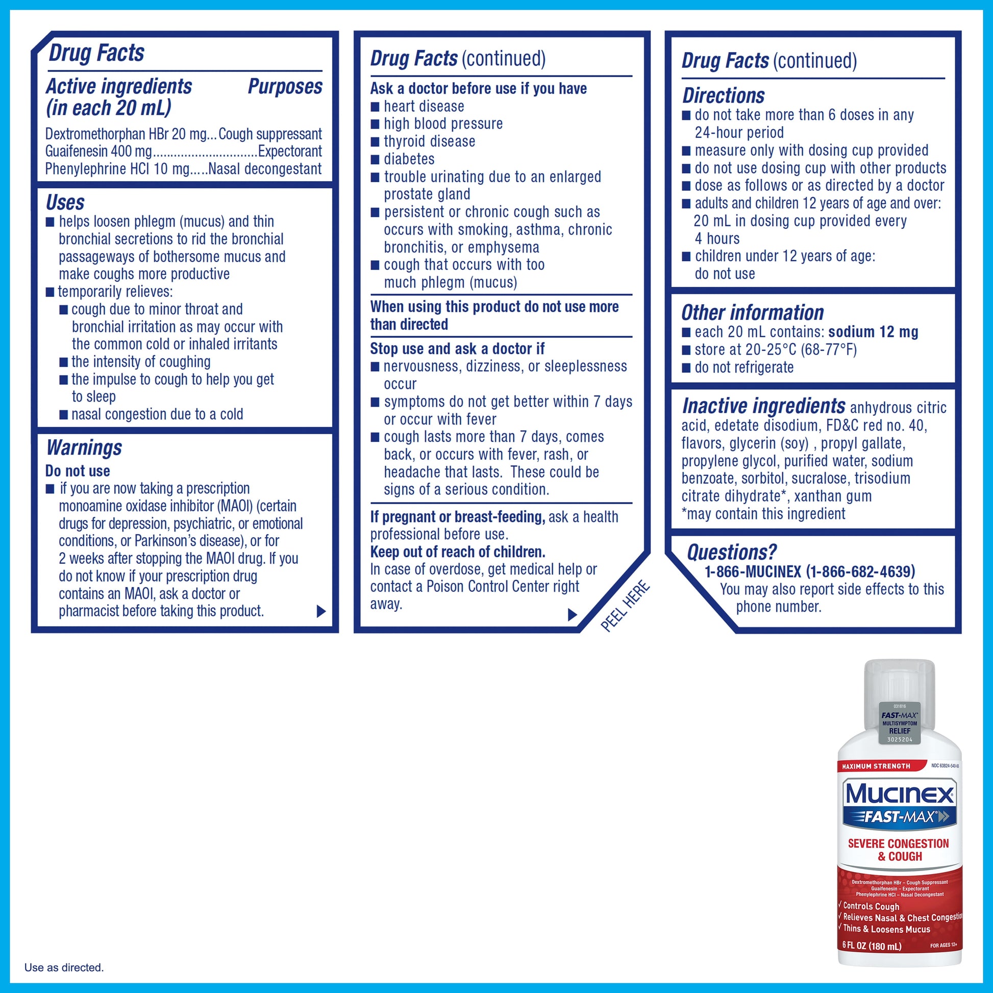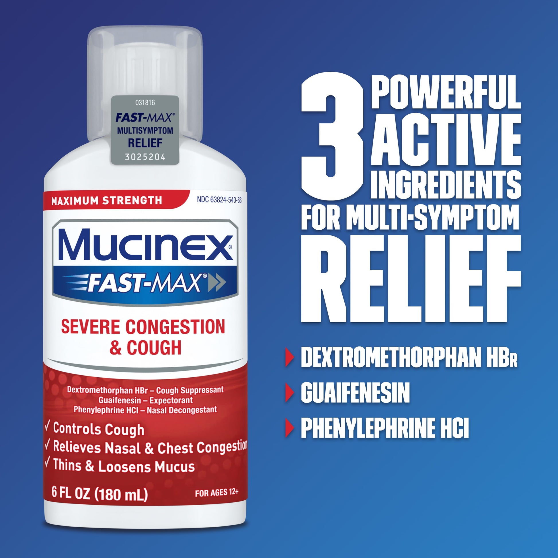 Maximum Strength Mucinex® Fast-Max Severe Congestion & Cough is a multi-Symptom relief medicine for your congestion & cough symptoms. Maximum Strength Mucinex® Fast-Max Severe Congestion & Cough helps relieve cough, thins and loosens mucus and relieves chest and nasal congestion. Mucinex® is the #1 Cough & Cold Brand Doctors Trust* and #1 Pharmacist Recommended Brand†. This product contains 6 Fluid Ounces. Use as directed, for Adults and Children 12 years of age and over. ACTIVE INGREDIENTS: Contains Dextromethorphan HBr - cough suppressant; Guaifenesin - expectorant; Phenylephrine HCI - nasal decongestant Take only as directed. *IQVIA using ProVoice Survey, August 2023. †U.S. News & World Report/Pharmacy Times 2023-2024.