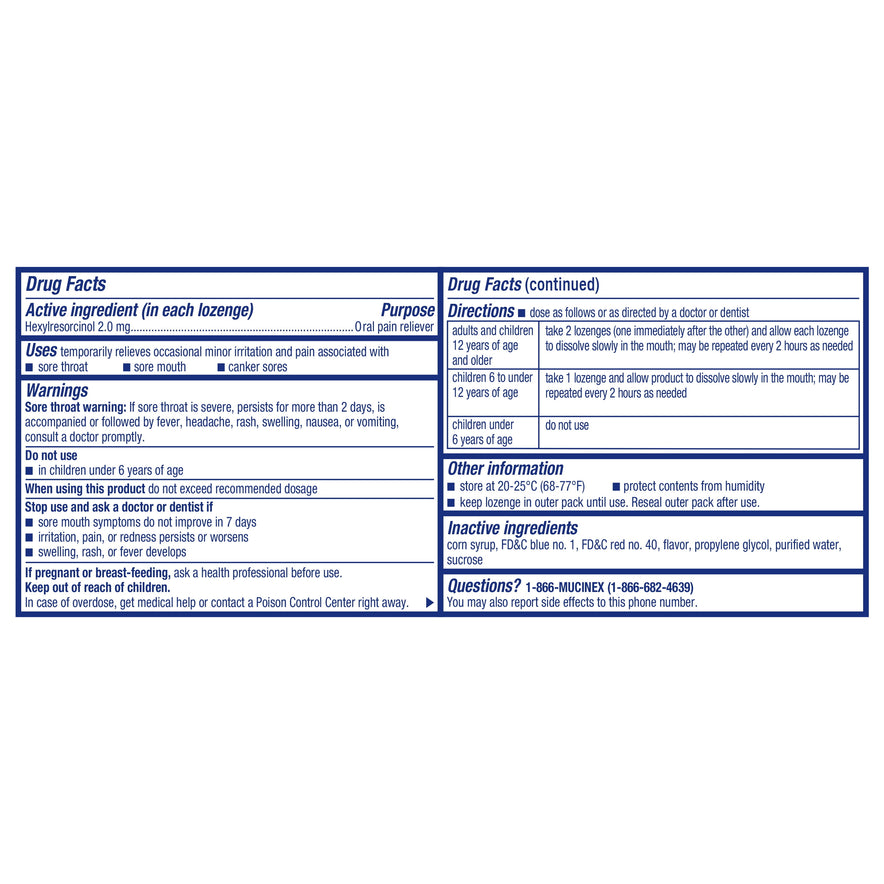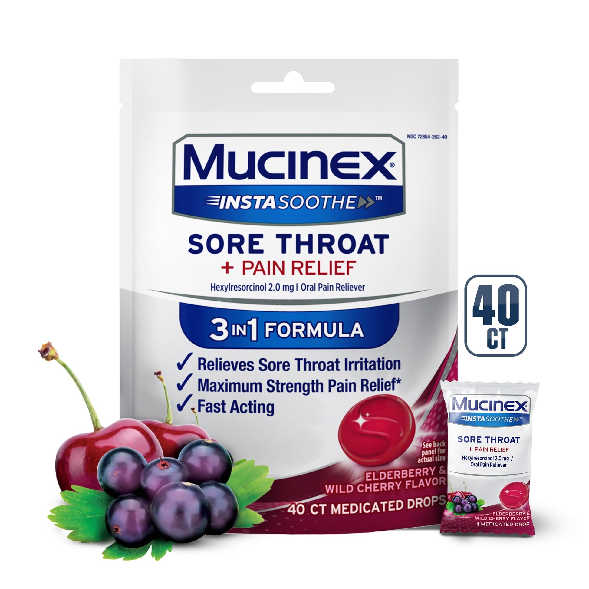Mucinex Instasoothe Sore Throat + Pain Relief medicated throat drops have a powerful 3 in 1 formula that relieves, soothes, and numbs sore throats. These elderberry & wild cherry flavor sore throat lozenges provide rapid relief that lasts & lasts. The active ingredient Hexylresorcinol, an oral pain reliever, provides powerful sore throat relief without menthol. Each medicated drop has less than 10 calories and 2.5g of sugar (no artificial sweeteners here!). Adults and children 12 years of age and over: take 2 lozenges (one immediately after the other) and allow each lozenge to dissolve slowly in the mouth; may be repeated every 2 hours as needed. Children 6 to under 12 years of age: take 1 lozenge and allow product to dissolve slowly in the mouth; may be repeated every 2 hours as needed. Children under 6 years of age: do not use. Looking for Mucinex cough drops? Check out our Mucinex Instasoothe Sore Throat + Cough Relief Alpine Herbs & Mint flavor medicated drops. For sore throat spray, try Mucinex Instasoothe Kickstart Sore Throat Winterfresh Flavor Spray. Look for Mucinex Fast-Max for cough & cold medicine to help get you through cold and flu season.