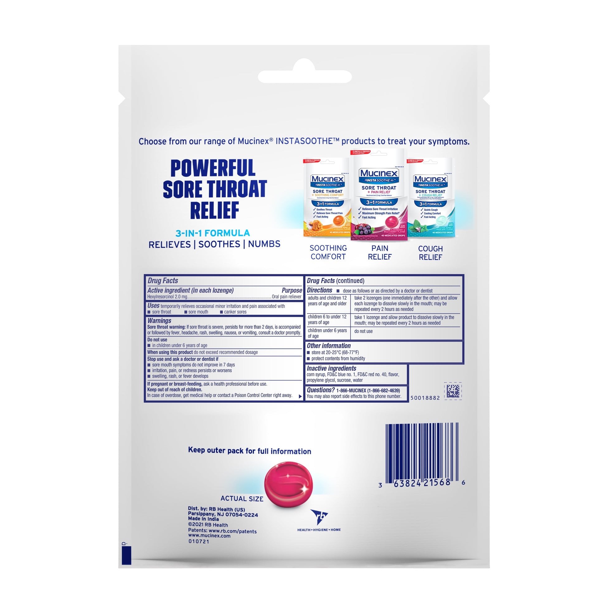 FAST ACTING SORE THROAT LOZENGES: Mucinex Instasoothe Sore Throat Drops provide rapid relief that lasts & lasts