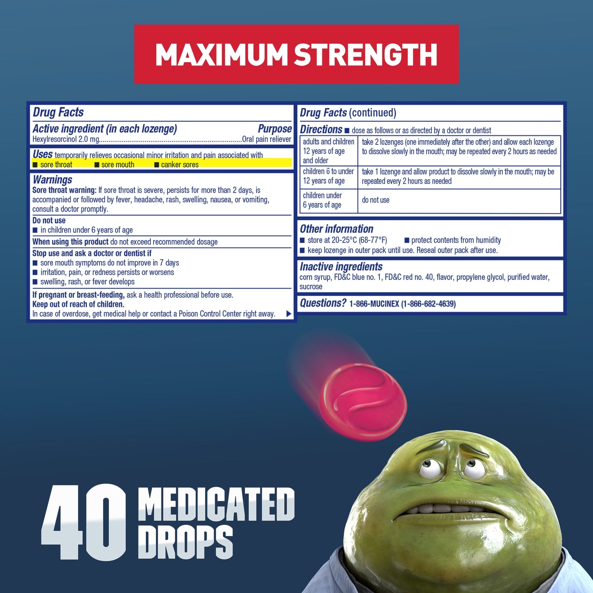 MUCINEX SORE THROAT RELIEF: These cough drops alternatives provide maximum strength pain relief* and temporarily relieves occasional minor irritation and pain associated with sore throat, sore mouth, and canker sores