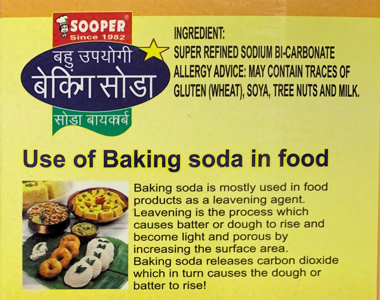 Sooper Multi Purpose Baking Soda 100g white crystalline compound, NaHCO3, with a slightly alkaline taste, used in making effervescent salts and beverages. Also called bicarbonate of soda, sodium bicarbonate.