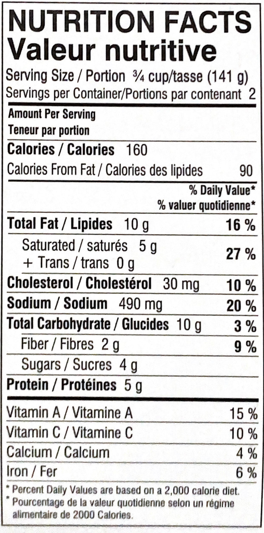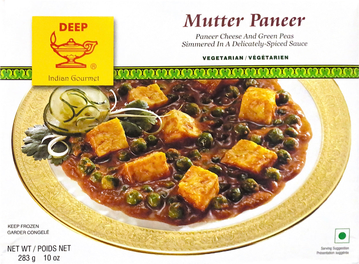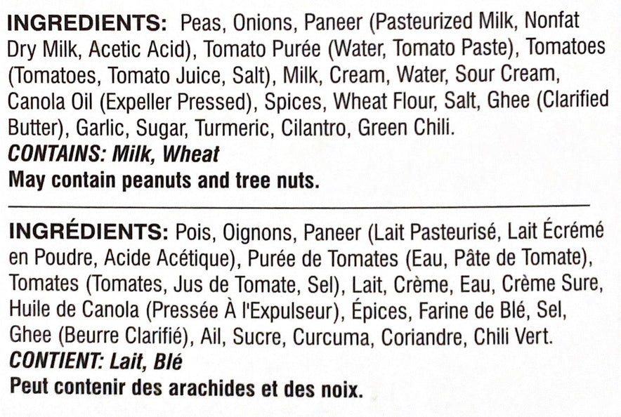 IngredientsPeas, Tomatoes (Tomatoes, Tomato Juice, Salt, Calcium Chloride, Citric Acid), Milk, Onions, Tomato Puree (Water, Tomato Paste, Citric Acid), Water, Cream, Paneer (Milk, Part Skim Milk, Vinegar, Salt), Corn Oil and/or Canola Oil, Sour Cream, Wheat Flour, Butter, Salt, Ginger, Garlic, Sugar, Spices, Turmeric, Peppers, Bay Leaves.