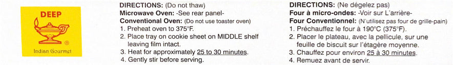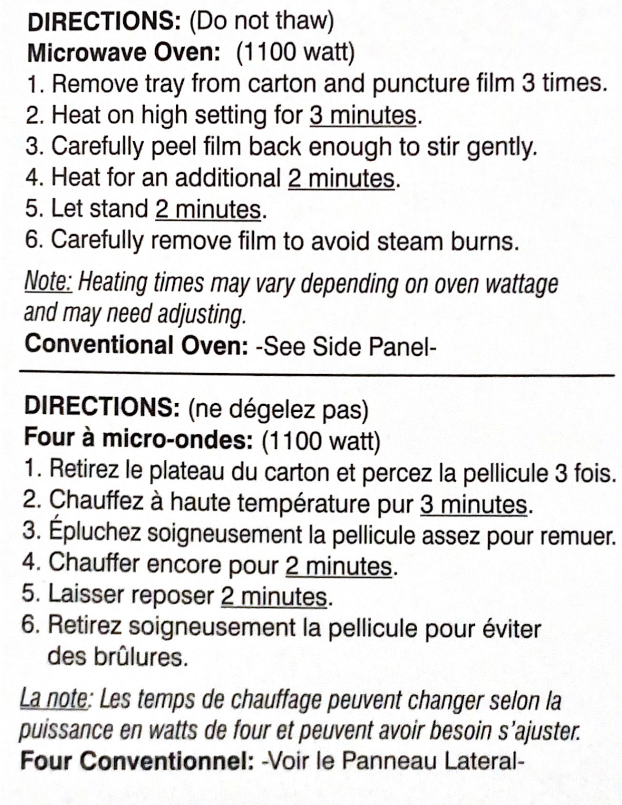 Keep frozen. Do not thaw. Microwave Oven: 1. Remove tray from carton and puncture film 2 to 3 times. 2. Heat on High setting for 3 minutes. 3. Carefully peel film back enough to stir gently. 4. Heat for an additional 2 minutes. 5. Carefully remove film to avoid steam burns. Note: Heating times may vary depending on oven wattage and may need adjusting. Conventional Oven: (Do not use toaster oven.) 1. Preheat oven to 375 degrees F for 15 minutes. 2. Place tray on cookie sheet on middle shelf leaving film intact. 3. Heat for approximately 25 to 30 minutes. 4. Gently stir before serving.
