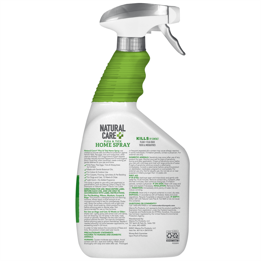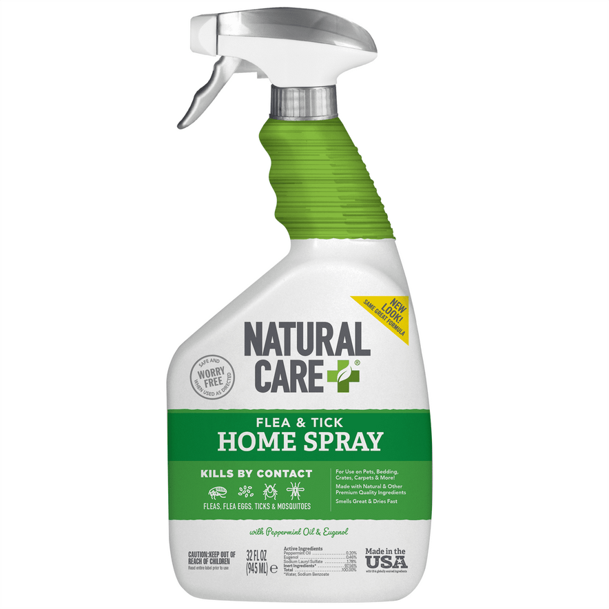 Natural Care Flea and Tick Home Spray (32 oz) repels mosquitoes and kills fleas, flea eggs, and ticks on-contact on multiple home surfaces and outdoors, when used as directed