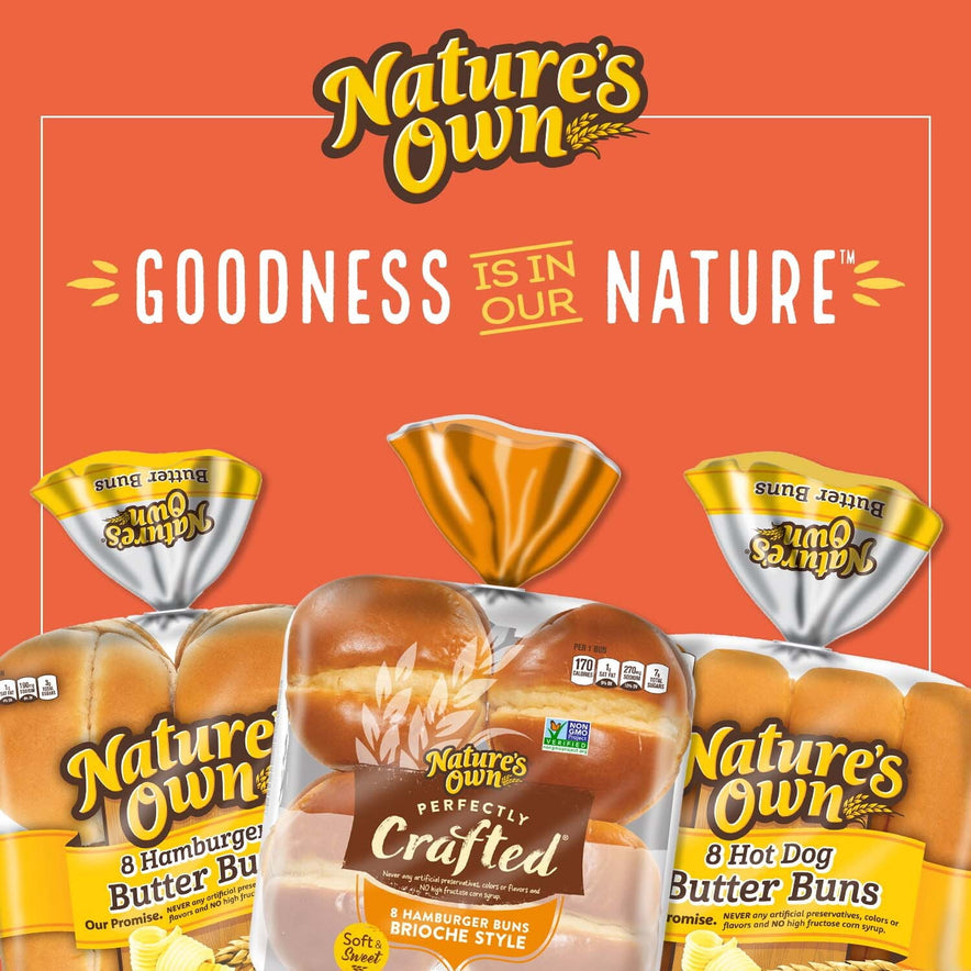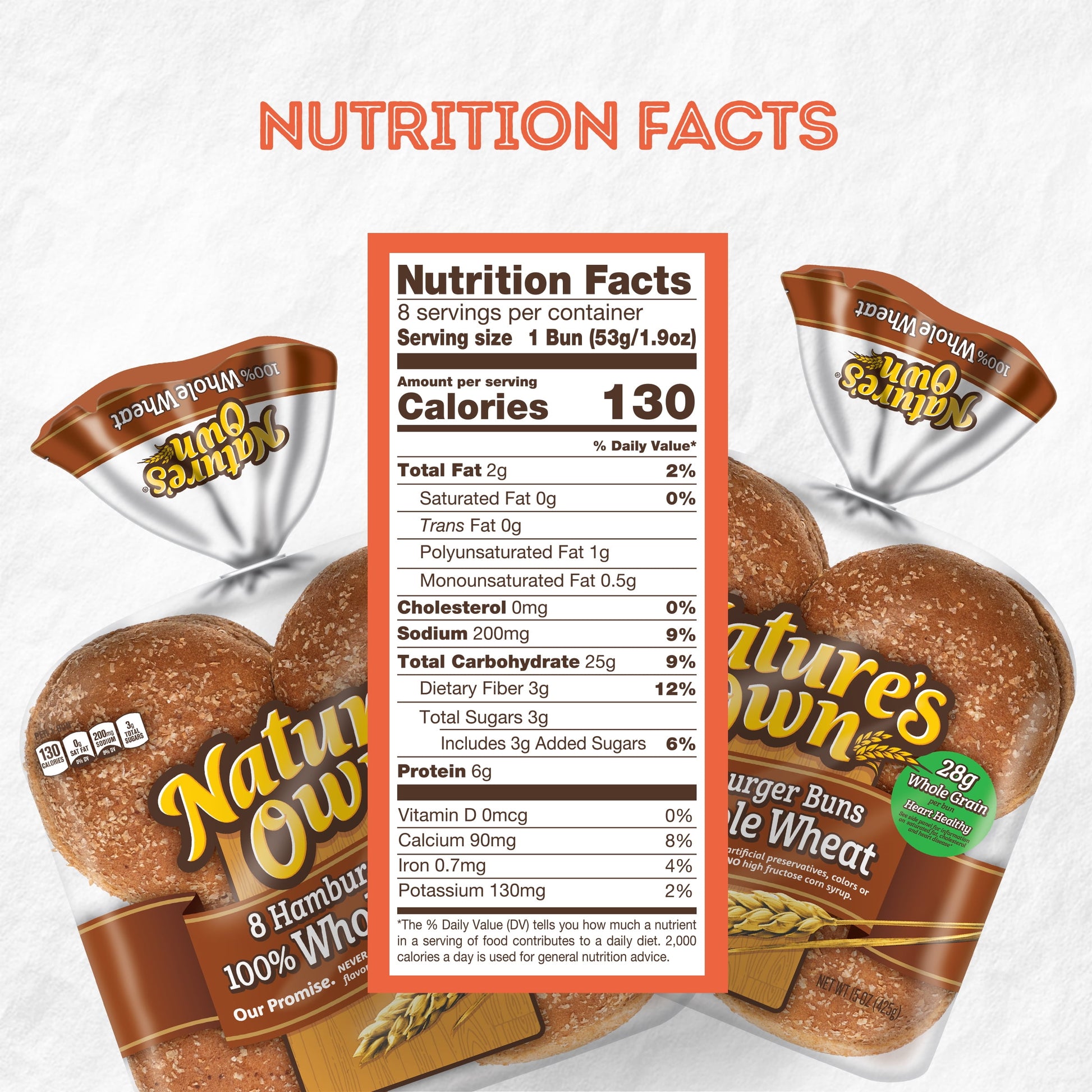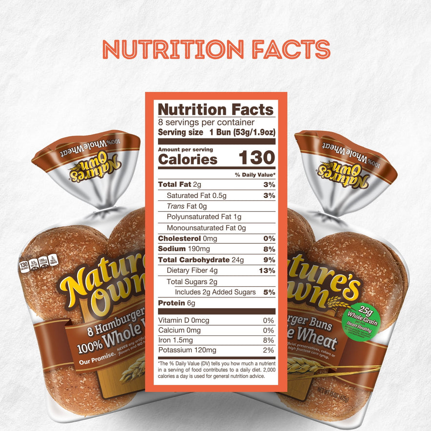 Bring goodness to the table at your next cookout with Nature's Own® 100% Whole Wheat Hamburger Buns. These fresh buns will perfectly complement your already delicious burger while also adding heart-healthy whole grains and fiber to your diet. You'll find it hard to believe that this delicious, soft bun bread has 25 grams of whole grains and 4 grams of fiber. Whether it's a homemade sloppy joe or a classic hamburger, you'll feel good about serving these burger bread buns. Pile on the goodness and bring everyone together with Nature's Own breads, honey wheat, dinner rolls and slider buns.At Nature's Own, we believe that anything worth doing is worth doing right. It's a standard applied to each and every product that makes its way out of Nature's Own bakeries. Choose from a variety of bread flavors and styles to fit whatever sandwich you have in mind. As America's #1 selling loaf bread brand,* Nature's Own maintains the freshness and softness that makes it a family favorite bread with no artificial preservatives, colors or flavors and no high-fructose corn syrup. Goodness is in our nature.*Source: IRI Syndicated Data for the total U.S. latest 52 weeks ending 07.24.22