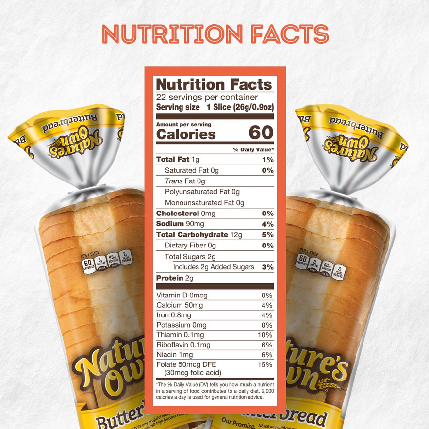 If you love the warm, homemade taste of buttered bread, you'll be a fan of this Nature's Own® Butterbread White Bread Loaf. Enjoy the subtle butter flavor baked into every bread slice. With 0 grams of trans fat per serving, Nature's Own Butterbread is a low-fat food and the perfect loaf of bread to have on hand for sandwich and toast recipes. You'll be amazed at how great your favorite sandwich tastes with Nature's Own Butterbread. Melt a couple slices of cheddar for a delicious grilled cheese or make it the base of a decadent French toast bread breakfast. You can even try using this in a monkey bread recipe. Pile on the goodness and bring everyone together with Nature's Own breads, buns and rolls.*Source: Circana Syndicated Data for the total U.S. latest 52 weeks ending 5.21.2023