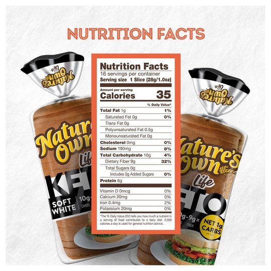 Get the most out of life with Nature's Own Life™ Keto Soft White Bread. This keto bread contains 1g net carbs per slice, providing a high flavor and fiber bread for those following a keto diet. Made to be delicious to the last bite, this sandwich bread also delivers on some very specific dietary preferences with 35 calories per bread slice. Pair it with your favorite meats and cheeses for a keto friendly lunch or toast it in the morning for a low-calorie breakfast. Pile on the goodness and bring everyone together with Nature's Own breads, buns and rolls.At Nature's Own, we believe that anything worth doing is worth doing right. It's a standard applied to each and every product that makes its way out of Nature's Own bakeries. Choose from a variety of bread flavors and styles to fit whatever sandwich you have in mind. As America's #1 selling loaf bread brand*, Nature's Own maintains the freshness and softness that makes it a family favorite bread with no artificial preservatives, colors or flavors, and no high fructose corn syrup. Goodness is in our nature.*Source: IRI Syndicated Data for the total U.S. latest 52 weeks ending 12.25.2022