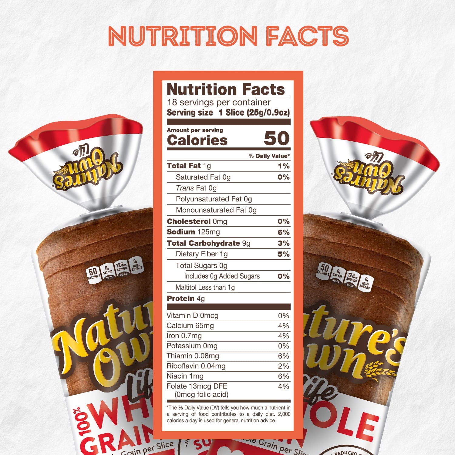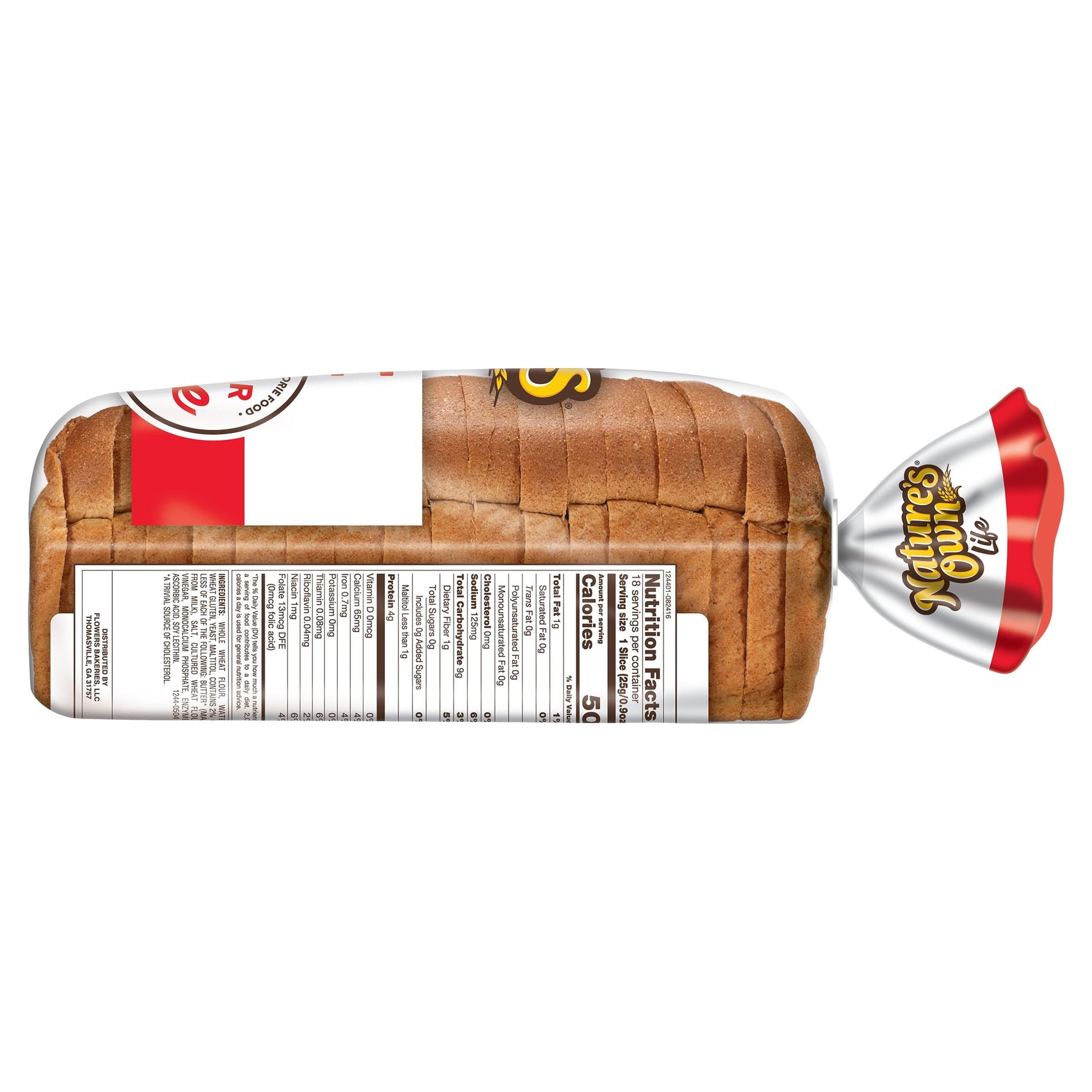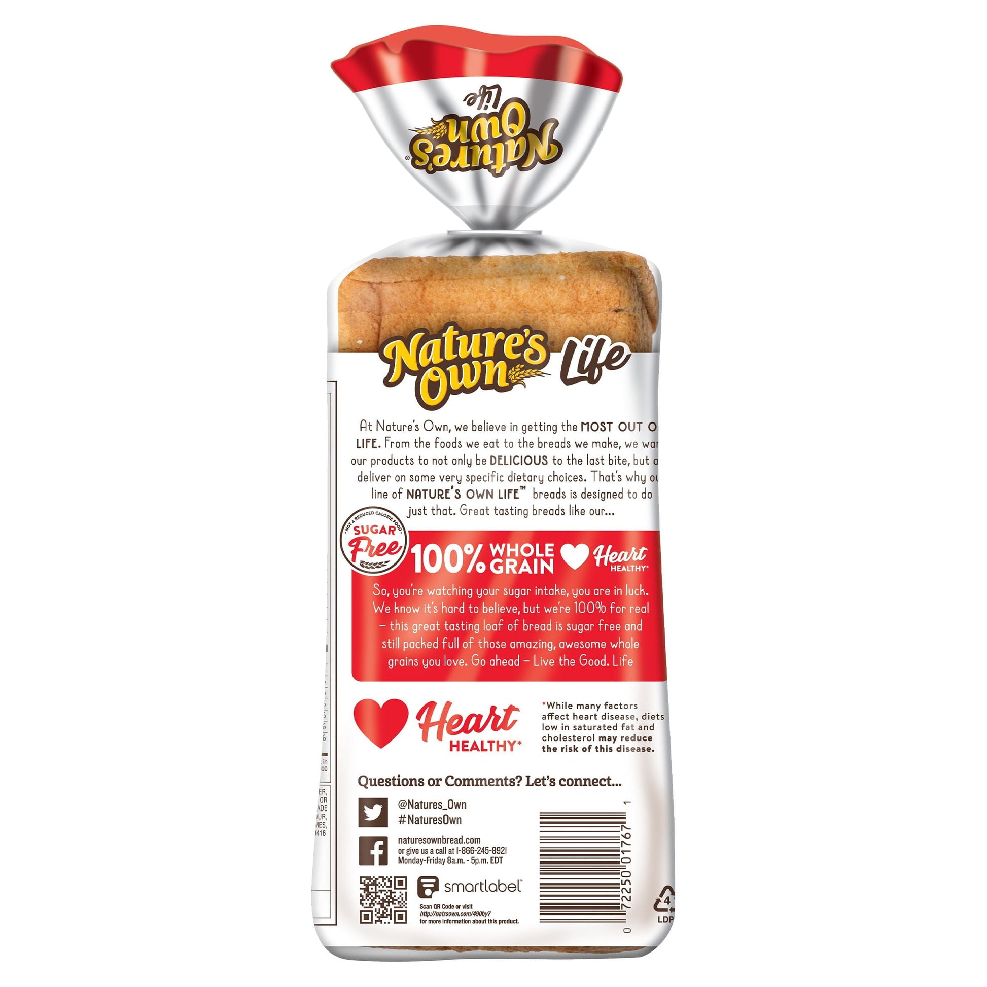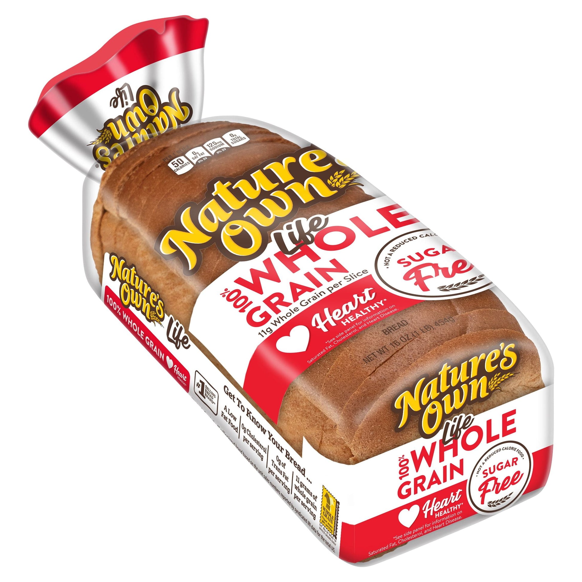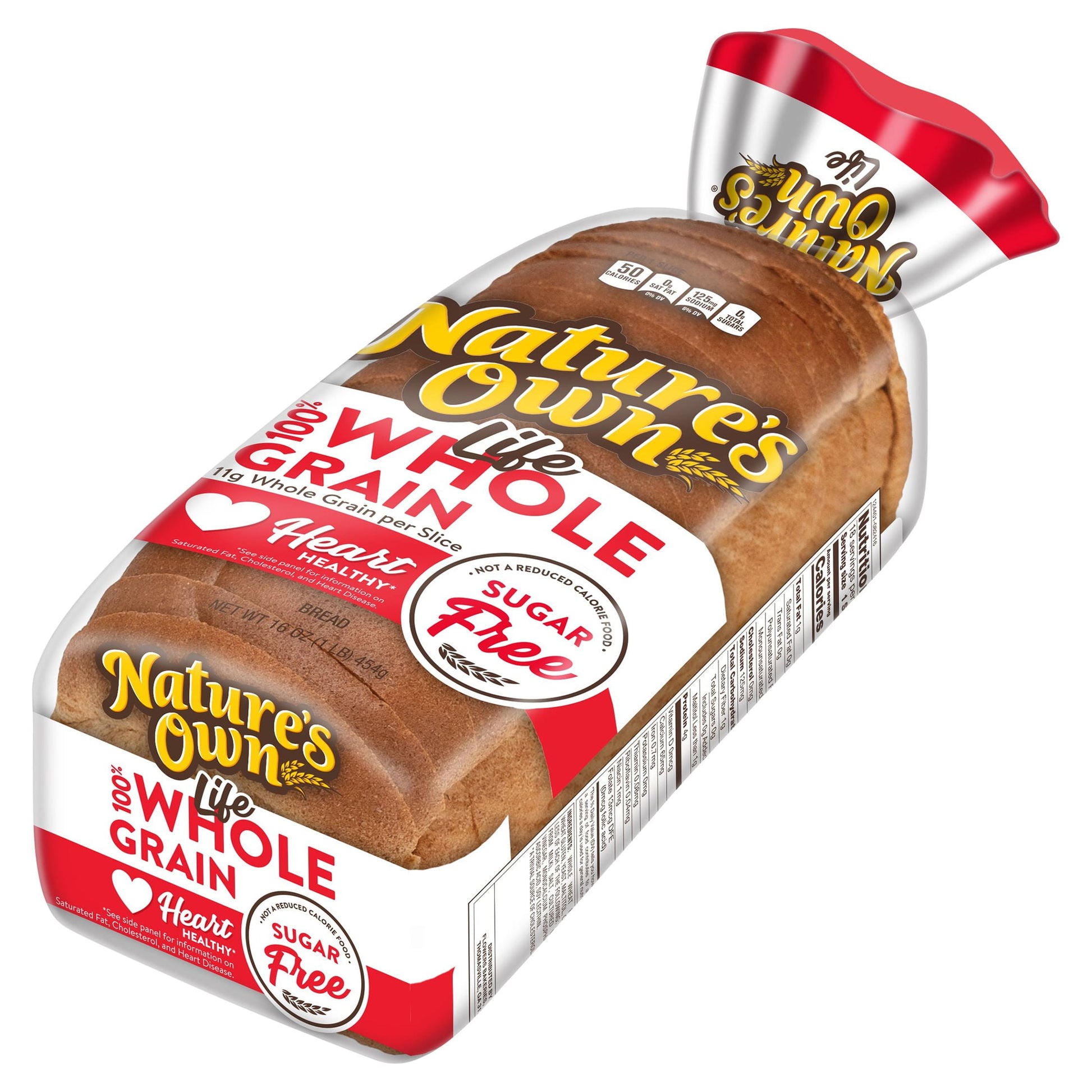 Go ahead and live a heart-healthy lifestyle with a loaf of Nature's Own Life Sugar-Free 100% Whole Grain Bread Loaf. Each bread slice has 11 grams of whole grains per serving and is completely sugar free. Your family will also enjoy bread that is deliciously soft and fresh. Bread from Nature's Own includes this sugar-free bread for adaptive diets. Plus, with 0 grams of trans fat, Nature's Own is a low-fat food perfect for a quick sandwich, bread spreads, and toast recipes. Top it with protein-rich deli meats and cheeses for a sugar-free sandwich worth dreaming about. Pile on the goodness and bring everyone together with Nature's Own whole grain breads, buns and rolls. (Not a low-calorie food)At Nature's Own, we believe that anything worth doing is worth doing right. It's a standard applied to each and every product that makes its way out of Nature's Own bakeries. Choose from a variety of bread flavors and styles to fit whatever sandwich you have in mind. As America's #1 selling loaf bread brand,* Nature's Own maintains the freshness and softness that makes it a family favorite bread with no artificial preservatives, colors or flavors and no high-fructose corn syrup. Goodness is in our nature.*Source: Circana Syndicated Data for the total U.S. latest 52 weeks ending 5.21.23