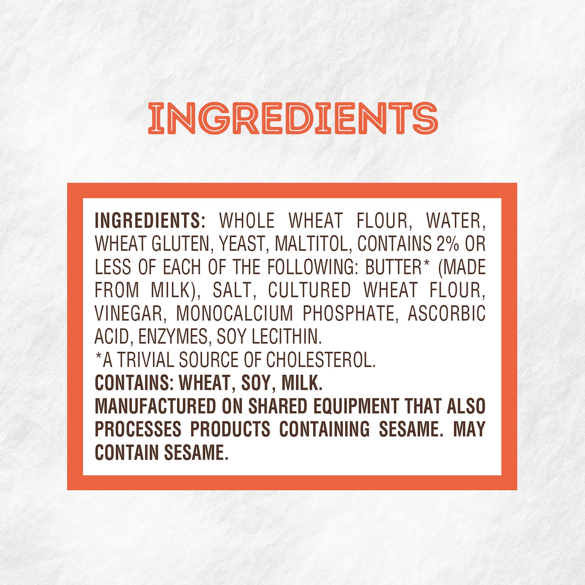 Manufactured on shared equipment that also processes products containing sesame. May contain sesame