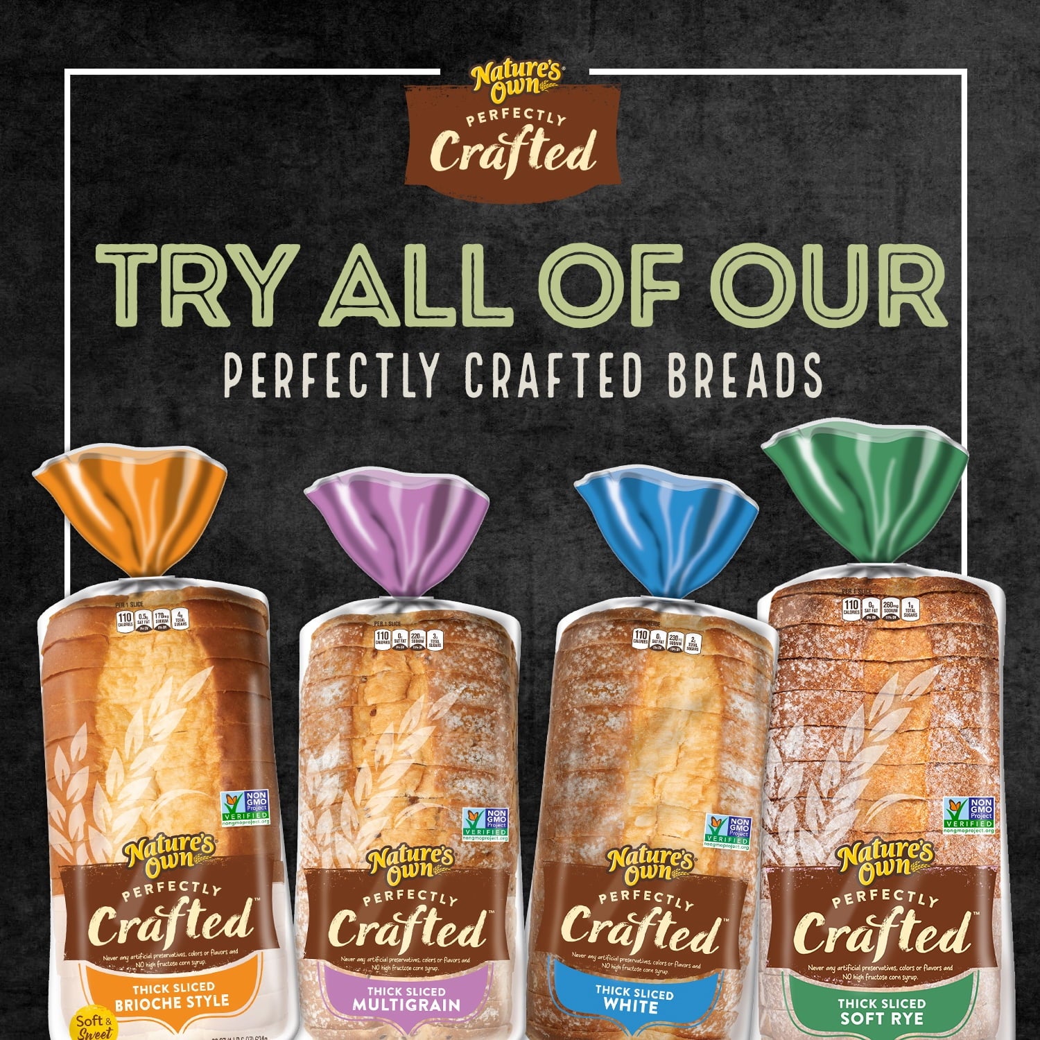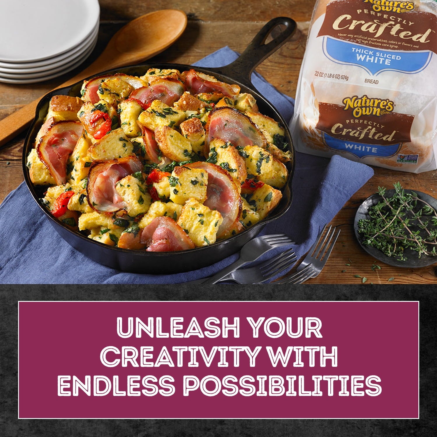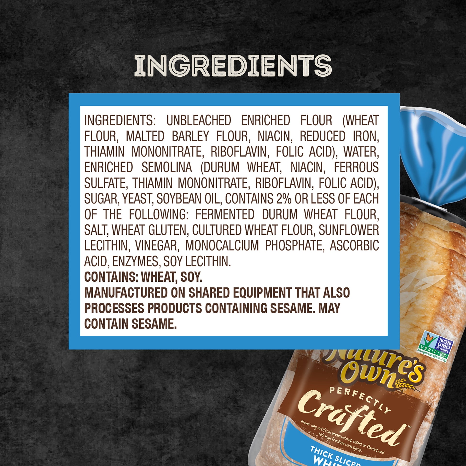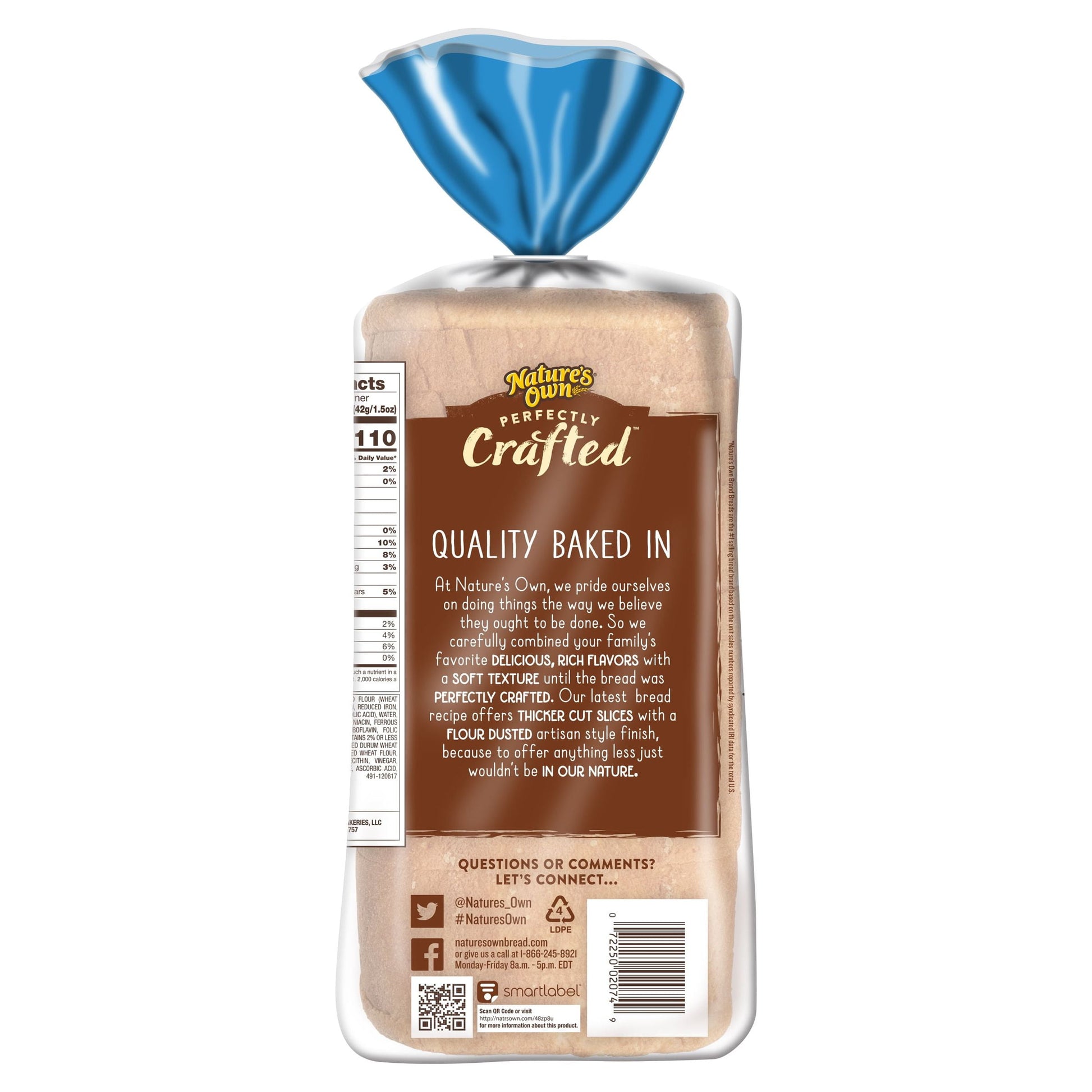 Nature's Own Perfectly Crafted® Thick-Sliced White Bread Loaf brings delicious artisan-style bakery bread taste from the bread aisle to your table. With approximately 15 fluffy, thick-cut bread slices featuring a flour-dusted crust, you can add gourmet flavor to everything from French toast to your favorite sandwich. Keep some white sandwich bread on hand to make your favorite monkey bread or a different take on French Toast. Nature's Own Perfectly Crafted sliced white bread has no artificial ingredients. So, you'll feel confident serving family and friends delicious choices from Nature's Own bread, America's #1 selling loaf bread brand.*Source: Circana Syndicated Data for the total U.S. latest 52 weeks ending 5.21.2023