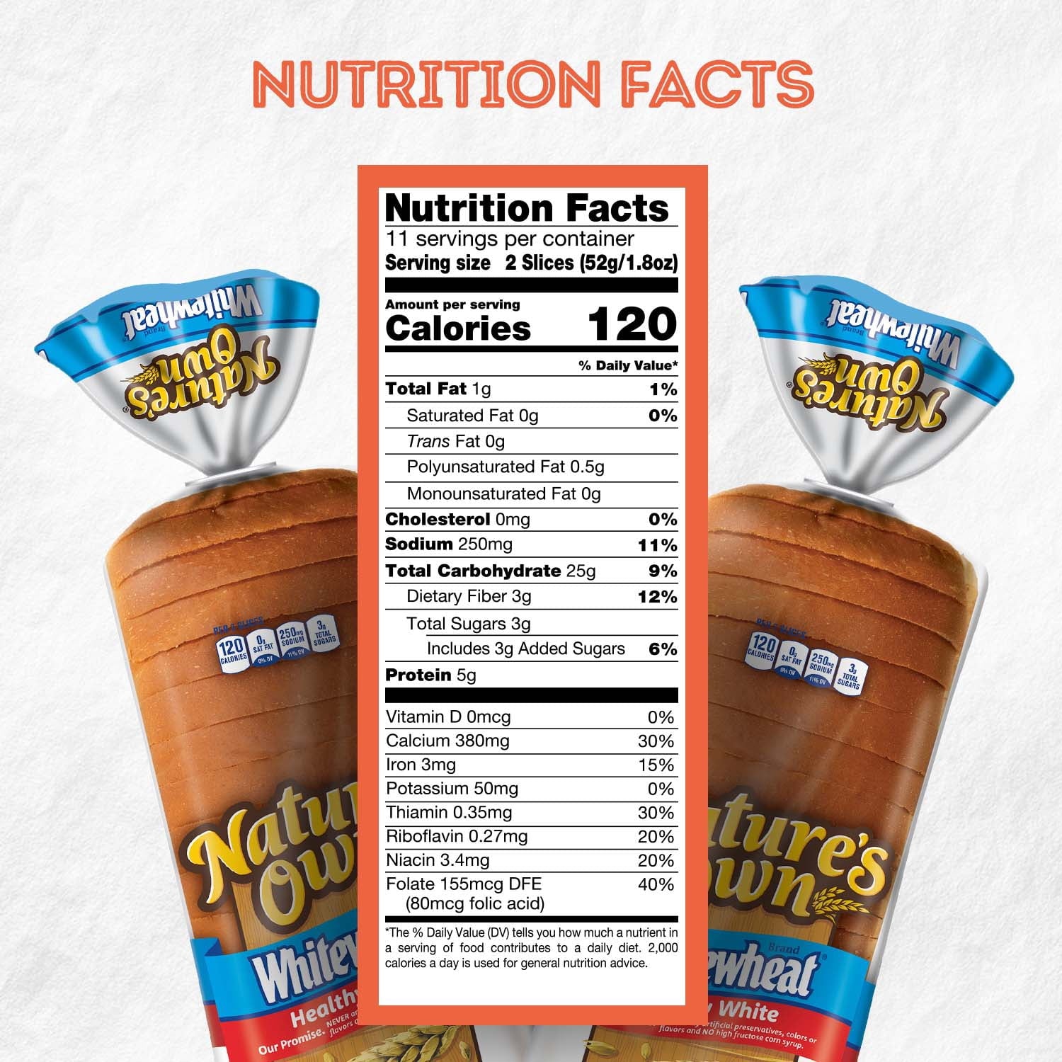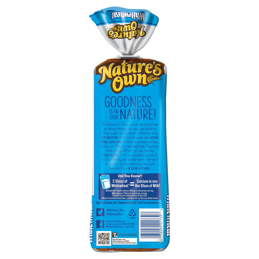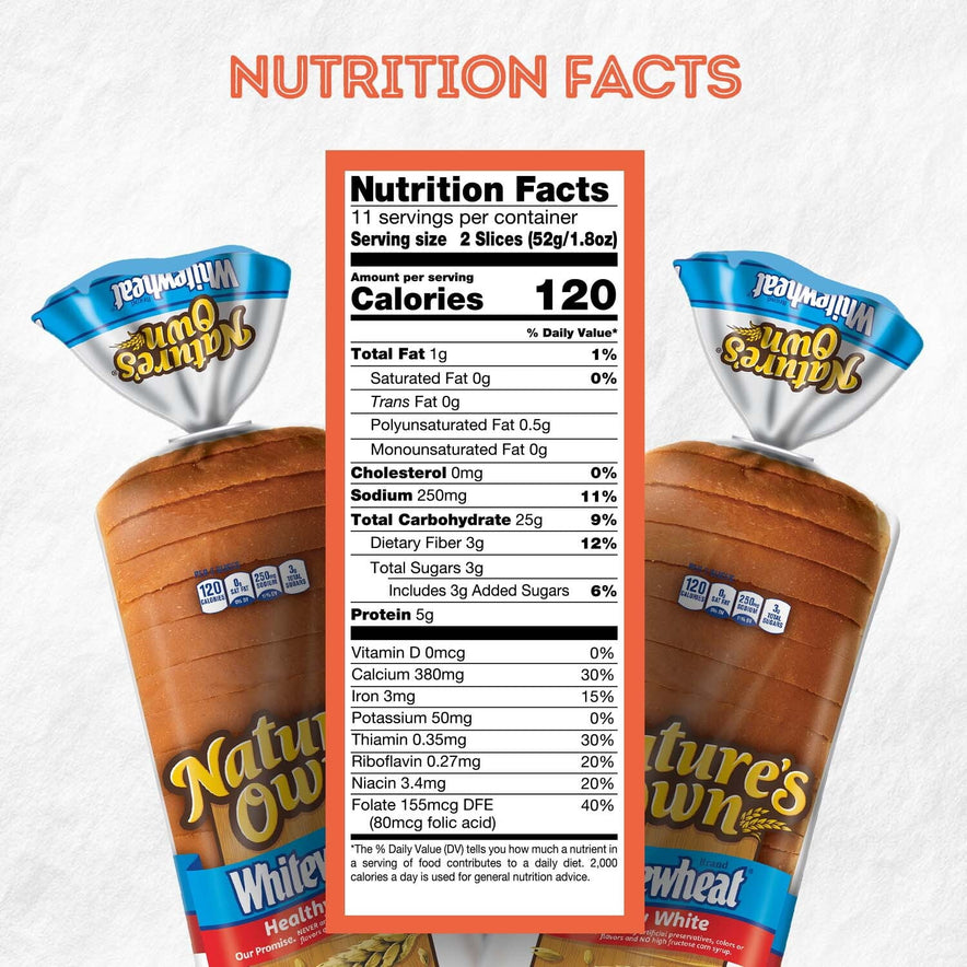 Do something good for your family and bring home a Nature's Own® Whitewheat® Healthy White Bread Loaf. Made with enriched flour, this healthy sliced white bread is a good source of both fiber and calcium. With 360 mg of calcium per serving, you can get the same amount of calcium from just two slices as you do from one 8 oz glass of milk. Our best-selling sandwich breads taste delicious, whether you make buttered toast or top it with peanut butter and jelly. You can even toss this loaf bread in butter, cinnamon and sugar to create a delicious monkey bread recipe. Pile on the goodness and bring everyone together with Nature's Own bread, buns and rolls.*Source: IRI Syndicated Data for the total U.S. latest 52 weeks ending 12/25/2022
