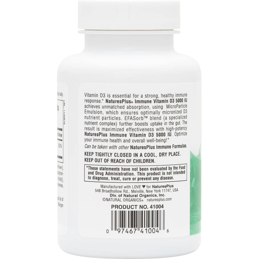 Vitamin D3 is essential for a strong, healthy immune response.NaturesPlus Immune Vitamin D3 5000 IU achieves unmatched absorption, using MicroParticle Emulsion, which ensures optimally micronized D3 nutrient particles. EFASorbâ„¢ blend (a specialized nutrient complex) further boosts uptake in the gut. The result is maximized effectiveness with high-potency NaturesPlus Immune Vitamin D3 5000 IU. Optimize your immune health and overall well-being!*