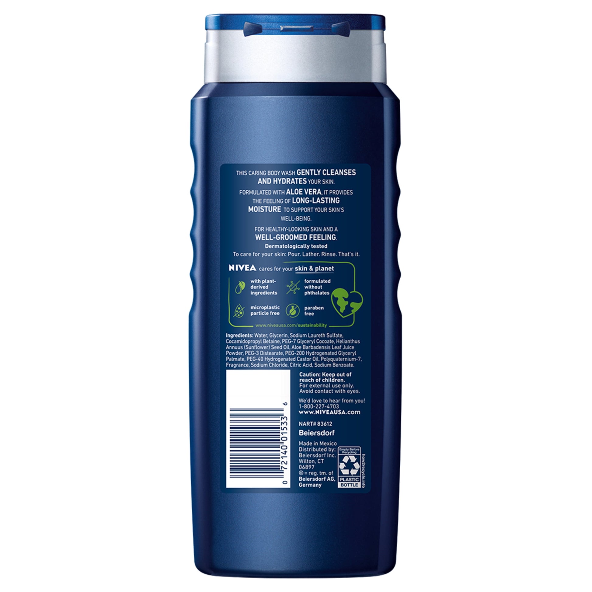 Take care of your skin with NIVEA MEN Maximum Hydration Body Wash. This moisturizing body wash is specially formulated for men with dry skin. NIVEA MEN Maximum Hydration Body Wash is enriched with Aloe Vera to gently cleanse and leave skin feeling hydrated and moisturized. This body wash can be used for shaving, and as a moisturizer, body wash and shampoo. With a long-lasting scent of citrusy notes and woody amber, this body wash creates a modern, masculine fragrance that leaves you feeling fresh long after the shower. It is also free of phthalates, parabens and microplastic particles. A hydrating body wash is a key part of a skin care routine and pairs well with NIVEA MEN Maximum Hydration Nourishing Body Lotion. To use, rub this NIVEA MEN body wash into a lather while gently massaging over body and rinse.