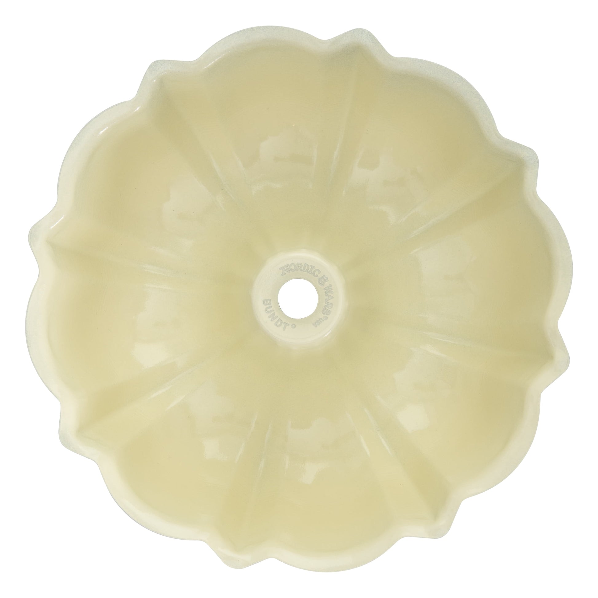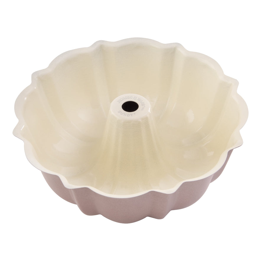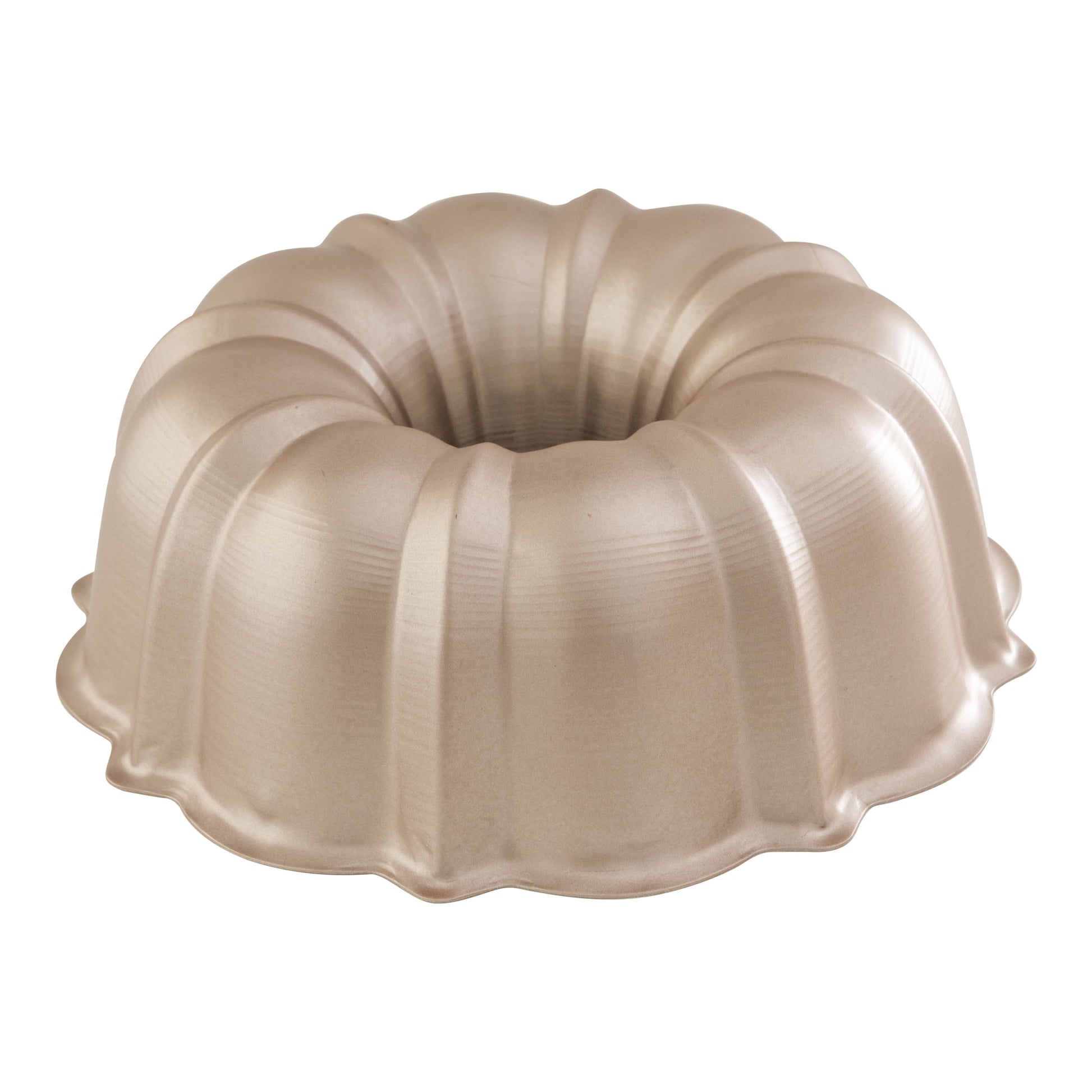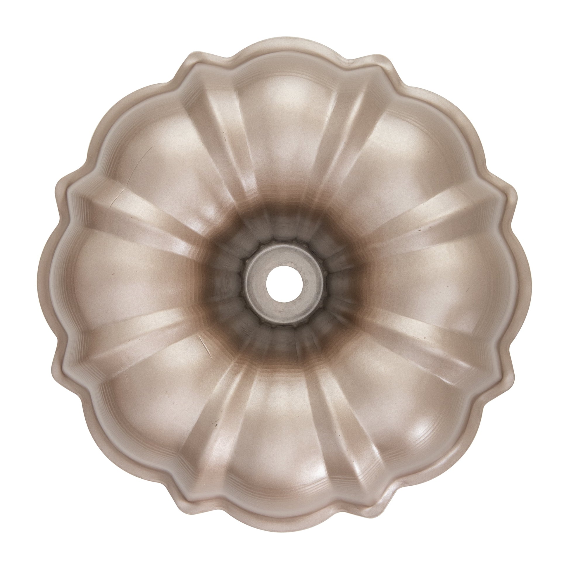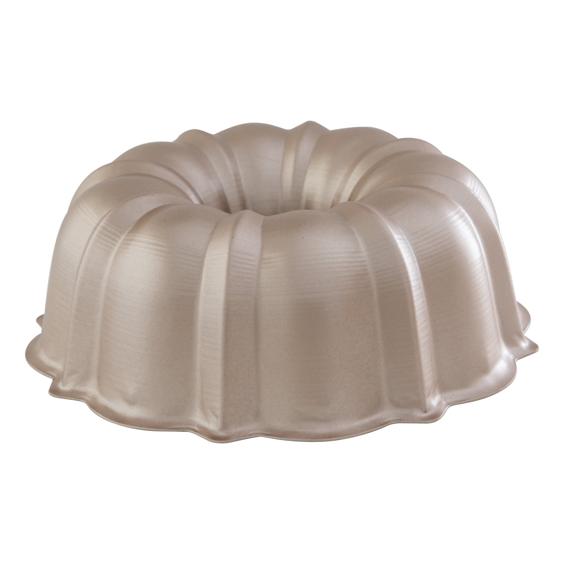 Formed aluminum conducts heat and bakes evenly for a perfect finish. Classic Bundt pan is made of lightweight formed aluminum, not to be confused with our heavier cast versions. Before each use, brush with solid vegetable shortening and dust with flour. Alternatively, you can use baking spray with flour in it allows the details to be more defined. Recipes vary, fill pan no more than three-quarters full to avoid overflow during baking. The nonstick finish made without PFAS works best with higher sugar and flour content of cakes and desserts. Cool 5 minutes in pan before removing to cool for best results, and always use baking spray with flour, not cooking spray when seasoning the pan. 12-cup capacity.
