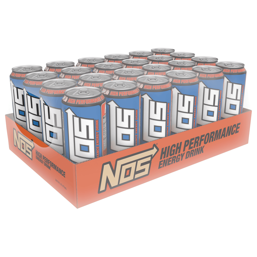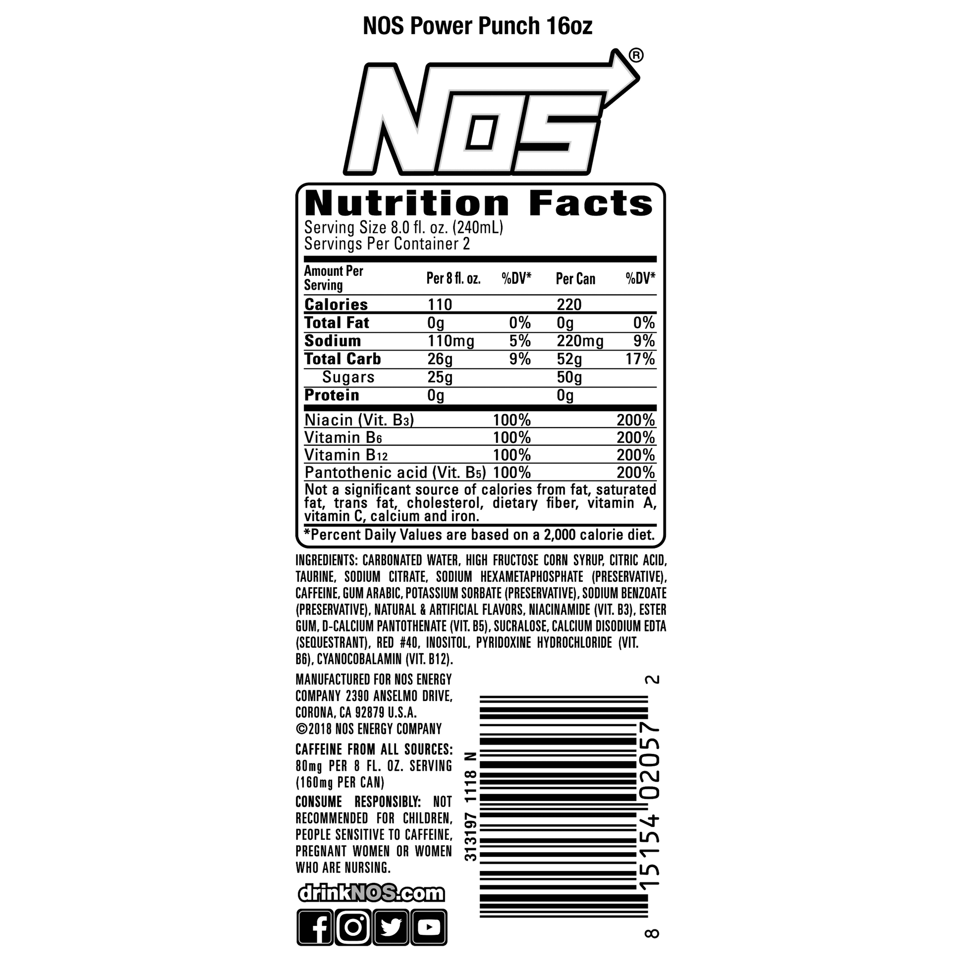 Energy Drink, High Performance, Can 16 OZ CMPLX6. High performance energy + enhanced mental focus. Taurine. Caffeine. Inositol. Vitamin B6. Guarana. Vitamin B12. Caffeine From All Sources: 80 mg per 8 fl oz serving (160 mg per can). Recycle NOS cans. drinkNos.com. Facebook. Instagram. Twitter. YouTube. Refrigerate after opening. Consume Responsibly: Not recommended for children, people sensitive to caffeine, pregnant women or women who are nursing. 16 fl oz (473 ml) 2390 Anselmo Drive Corona, CA 92879 2016 NOS Energy Company NOS Original Energy Drink