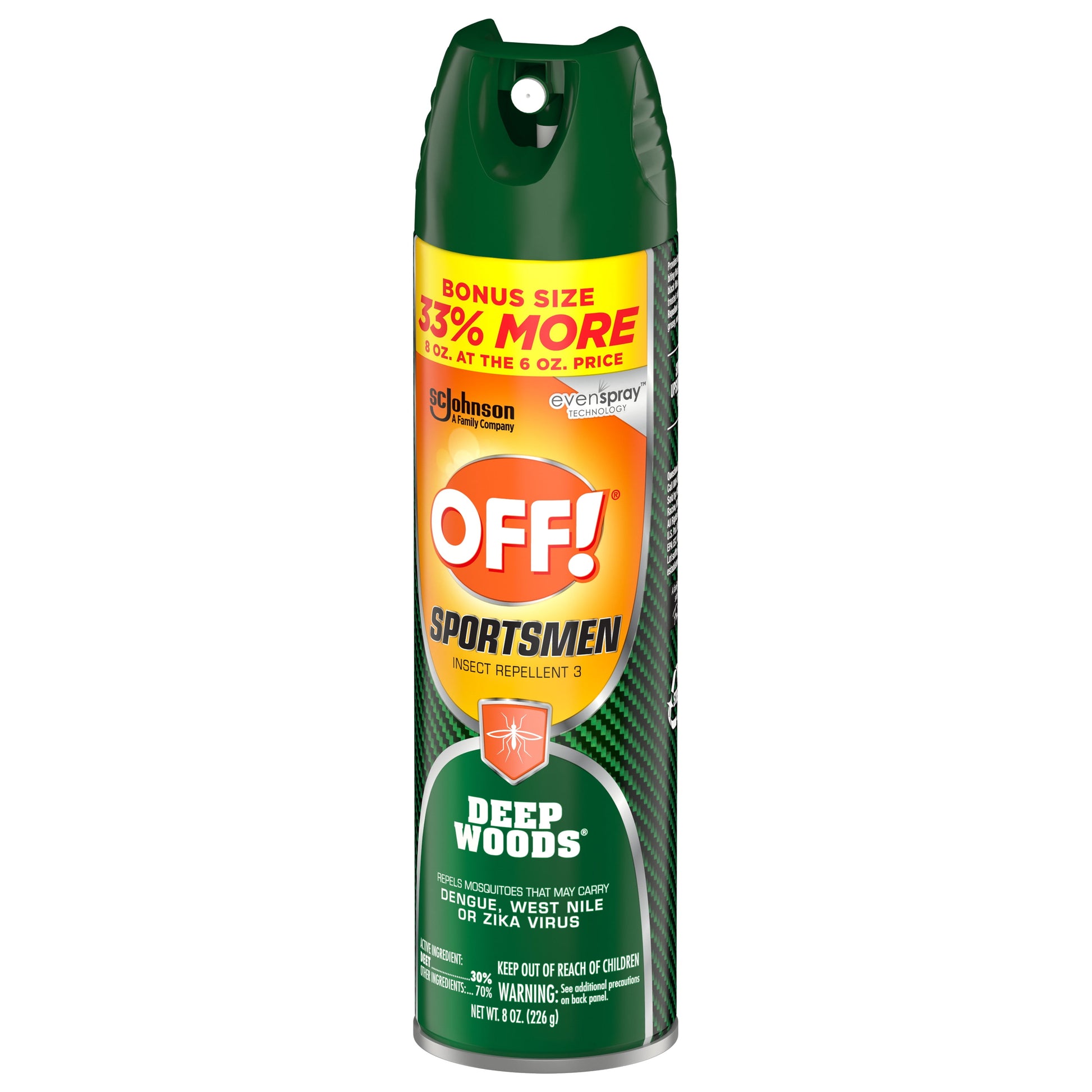 Get strong bug repellent defense with OFF! Deep Woods Sportsmen Insect Repellent 3. This bug spray provides long lasting protection from mosquitoes and biting flies: gnats, sand flies, no-see-ums, stable flies, and black files. It also repels ticks, chiggers and fleas from treated skin and clothing.OFF! Deep Woods Sportsmen Insect Repellent III has a DEET aerosol formula is not greasy, won't stain and resists perspiration so it's an excellent mosquito spray for active outdoor enthusiasts. Whether camping, playing sports, hiking, hunting, or fishing, OFF! sweat resistant bug spray provides long lasting protection.