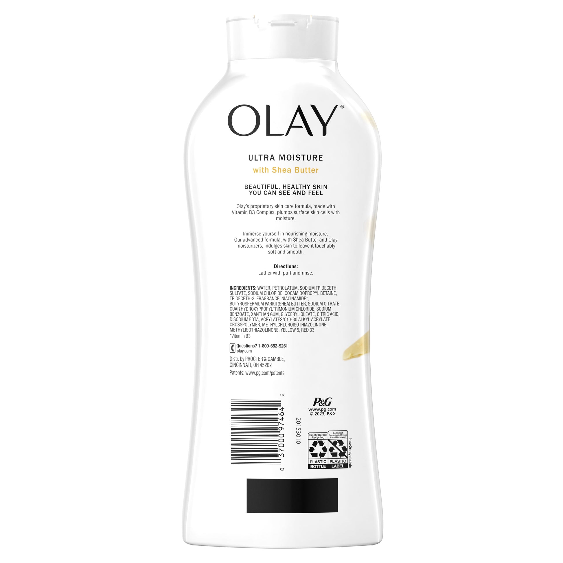 BEAUTIFUL, HEALTHY SKIN YOU CAN SEE AND FEEL - Reveal beautiful, healthy-looking skin with Olay Ultra Moisture Body Wash with Shea Butter. Now formulated with Olayâs Vitamin B3 Complex, it hydrates to plump surface skin cells, locking in natural moisture. Our advanced formula, with Shea Butter and Olay moisturizers, indulges skin to leave it spa-soft and touchable smooth. All Female Skin Types