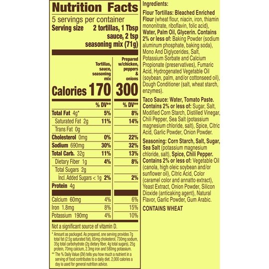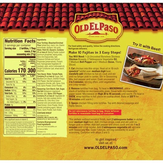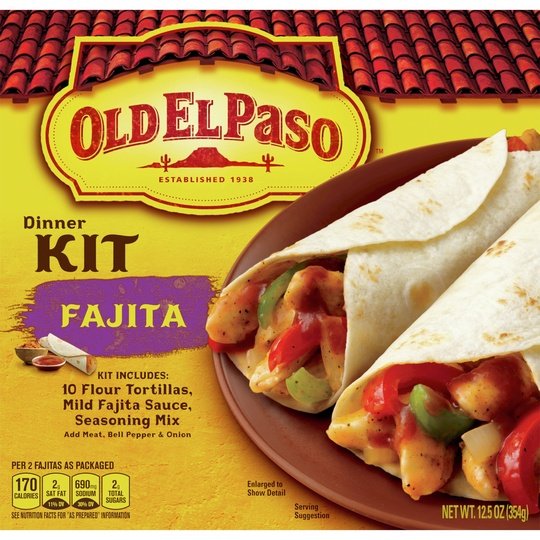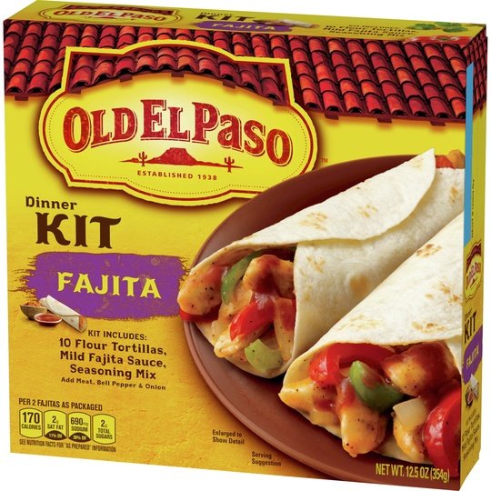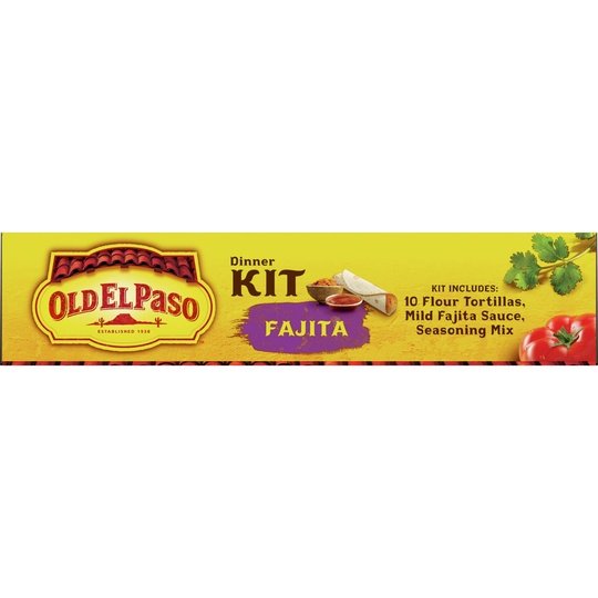 Grab an Old El Paso Fajita Dinner Kit for a quick and easy fajita fiesta that the whole family can enjoy. Each dinner kit comes with 12.5 ounces of 10 dry flour tortillas, fajita seasoning mix and mild fajita sauce. Simply choose your protein of choice and your favorite fajita toppings and get started making an easy weeknight dinner. This fajita kit is great for both chicken and beef fajitas. One box makes about 5 servings. Enjoy the delicious spices and seasonings that make up another delicious Old El Paso meal option.For more than 80 years, Old El Paso has been bringing families and communities together to celebrate old and new traditions around delicious, Mexican-inspired flavors. We believe that any night can be a taco night, and we’re here to help make it a little easier and a lot more delicious. Our variety of crispy hard taco shells, tasty soft tortillas, flavorful seasonings, and much more help make taco night fun.