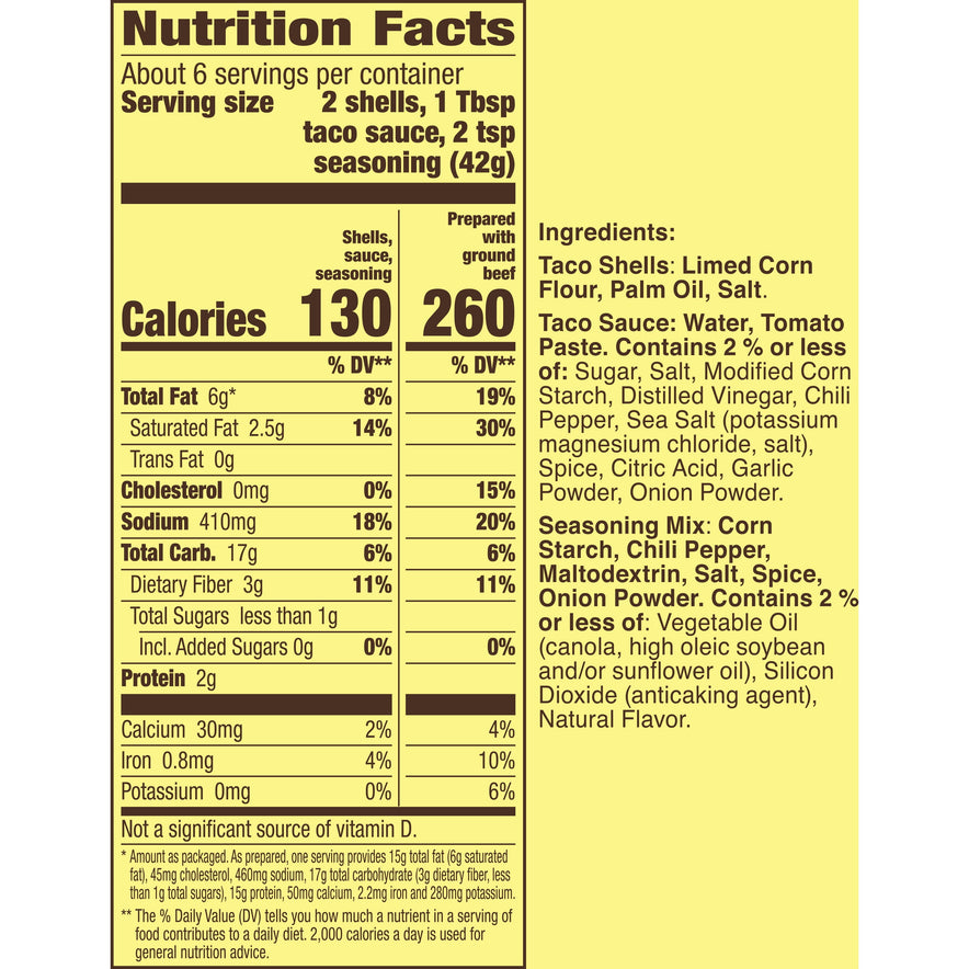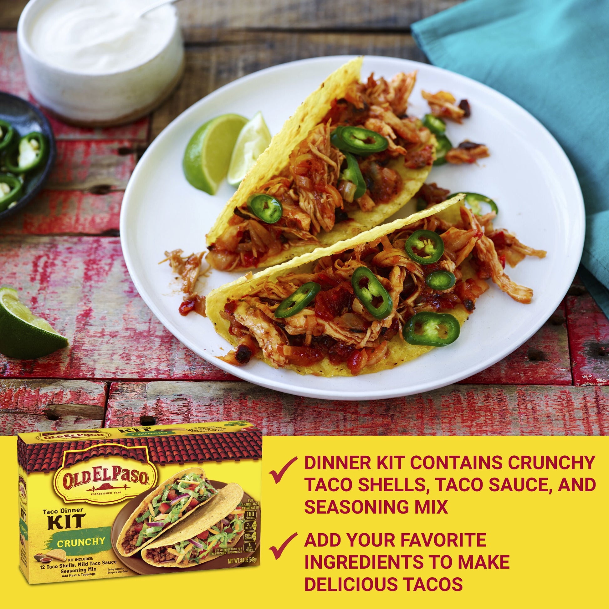 Take the trouble out of taco night with Old El Paso Crunchy Taco Shells Dinner Kits. You get 8.8 ounces of 12 Old El Paso crunchy taco shells, taco seasoning and taco sauce all in one box, so your tacos can be ready in about 20 minutes. Simply add your favorite fillings and toppings to create an easy and delicious fiesta any night of the week. Tonight, we taco!For more than 80 years, Old El Paso has been bringing families and communities together to celebrate old and new traditions around delicious, Mexican-inspired flavors. We believe that any night can be a taco night, and we’re here to help make it a little easier and a lot more delicious. Our variety of crispy hard taco shells, tasty soft tortillas, flavorful seasonings, and much more help make taco night fun.