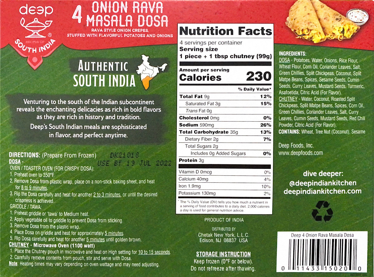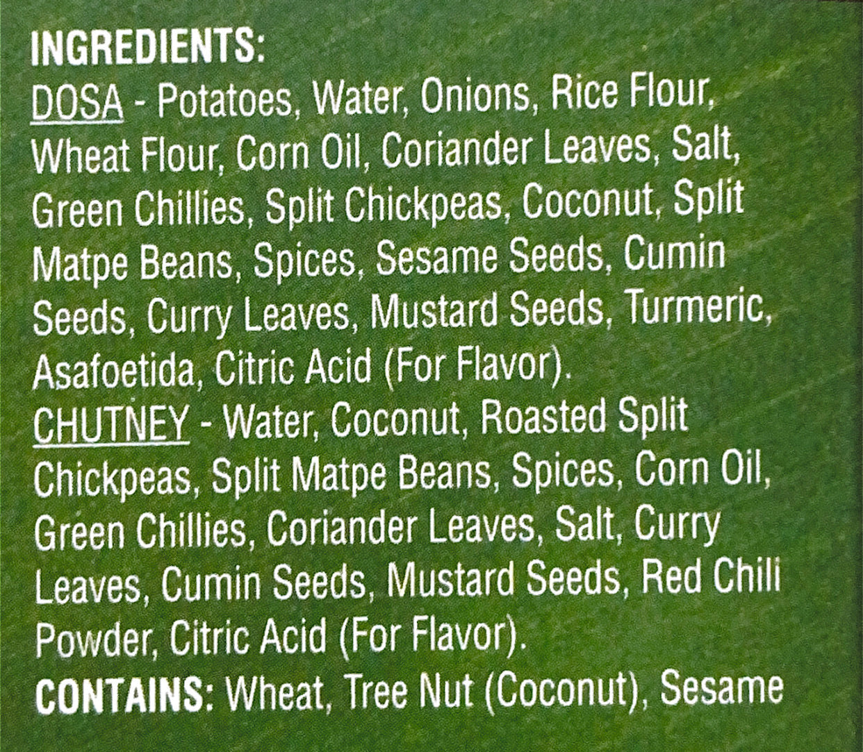 Ingredients: potatoes, water, onions, rice flour, semolina, corn oil, coriander leaves, salt, wheat flour, green chillies, fresh coconut, split chickpeas, split matpe beans, sesame seeds, curry leaves, mustard seeds, turmeric powder, asafoetida, dry red chillies, citric acid.