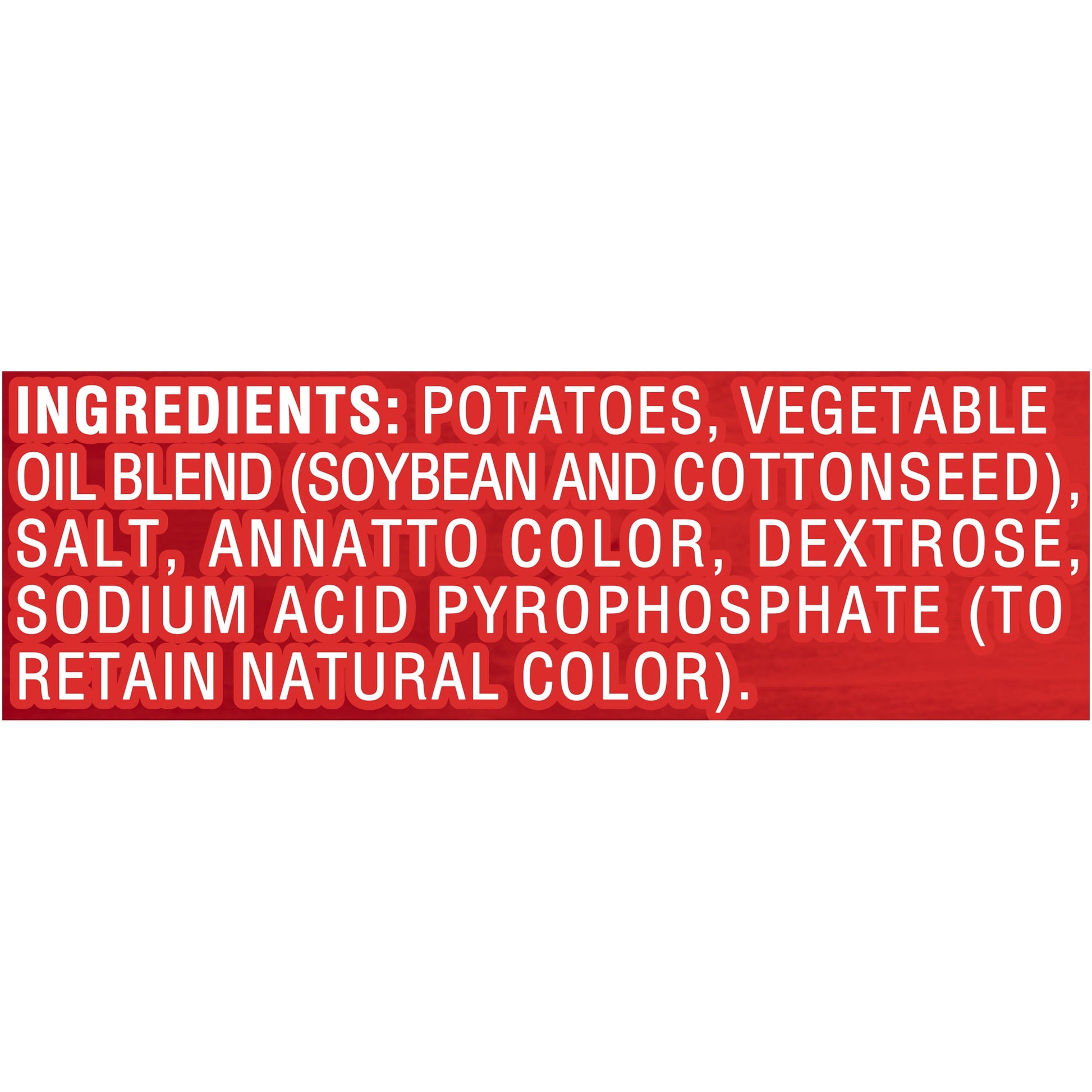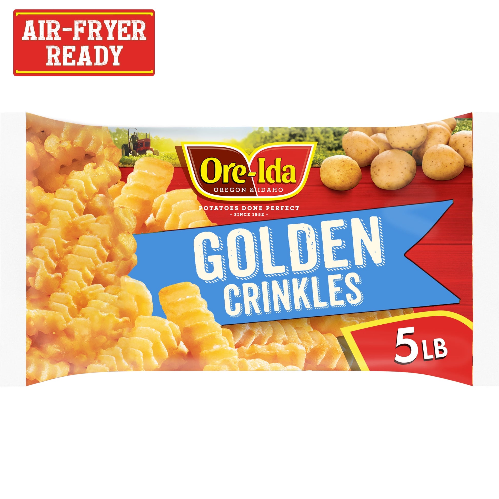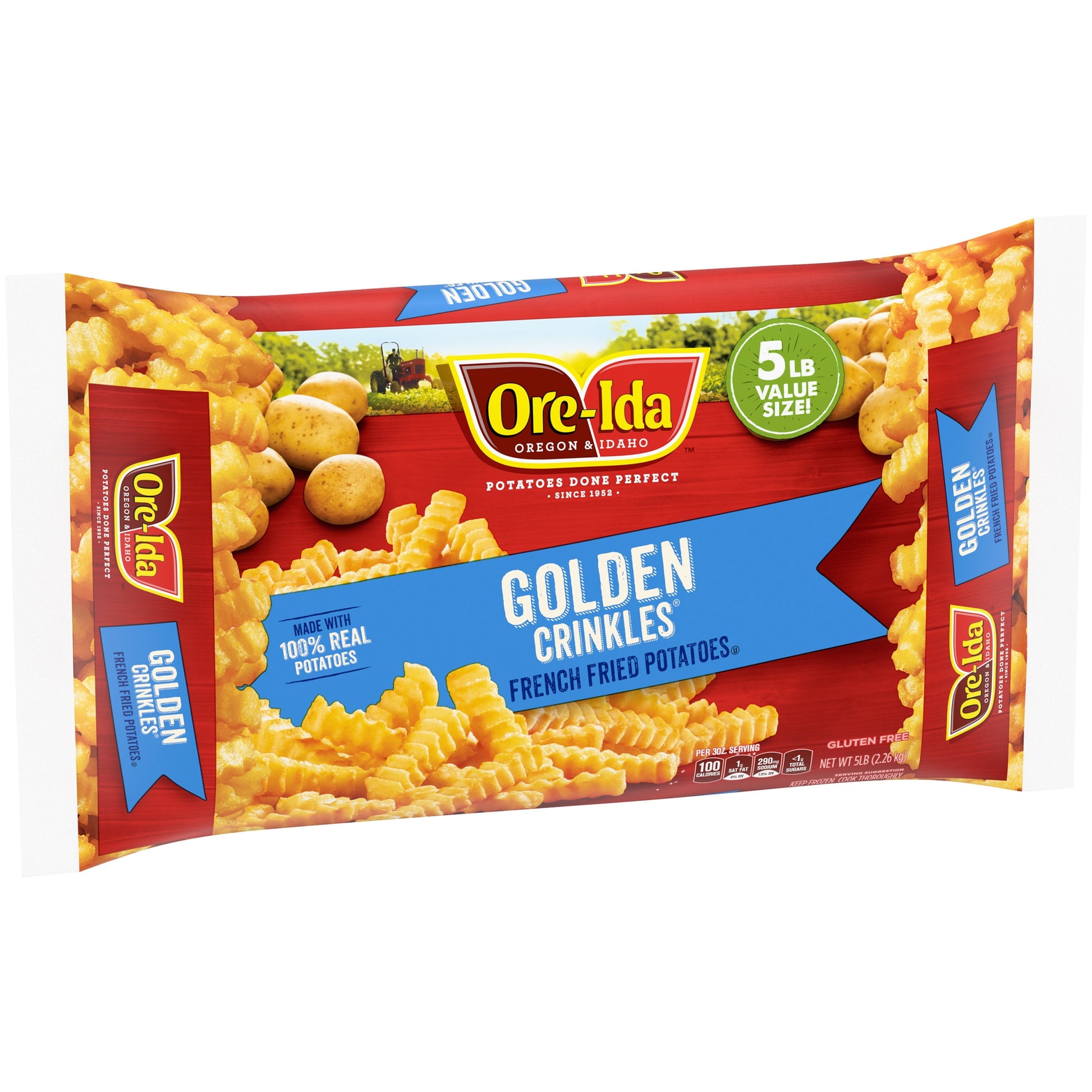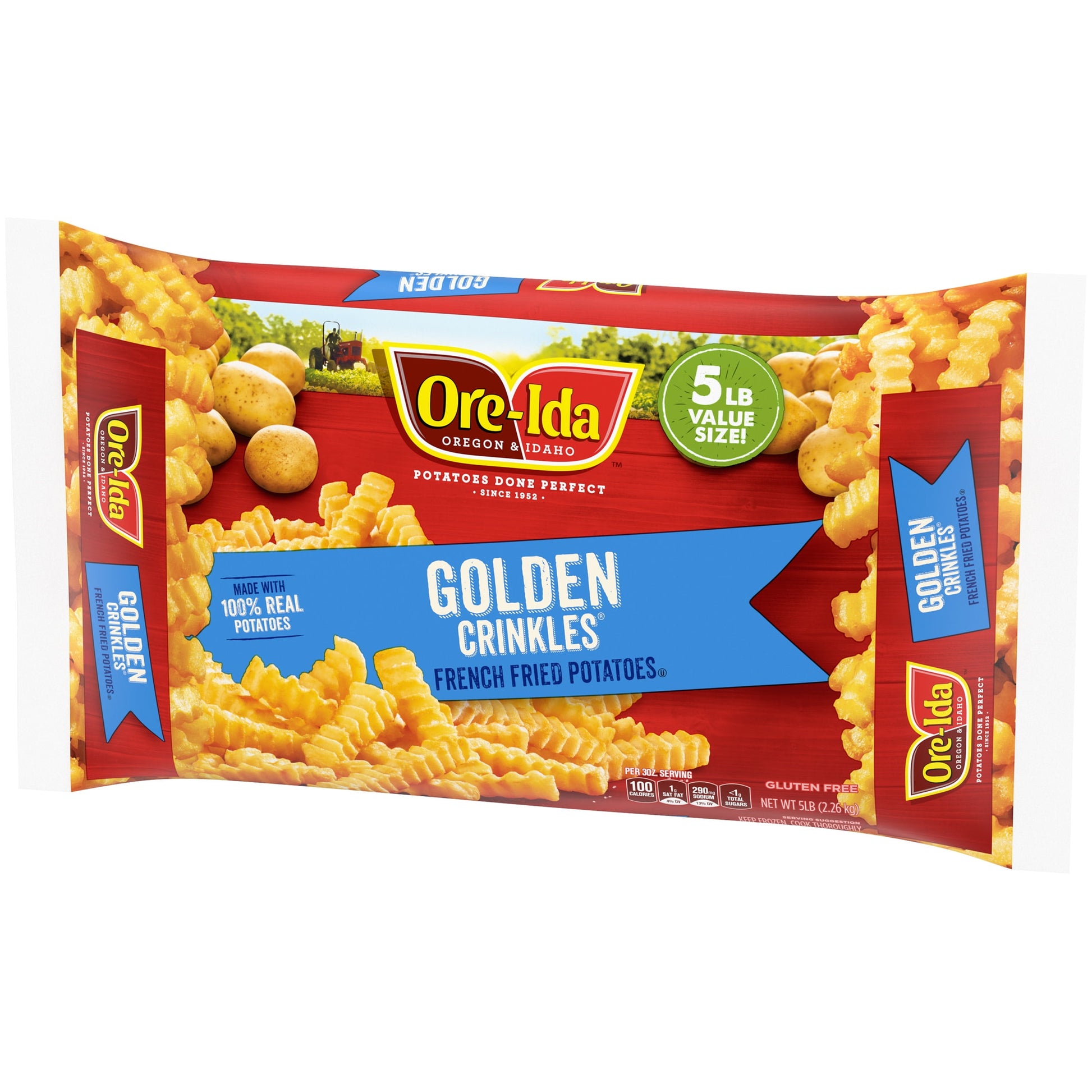 Ore-Ida Golden Crinkles French Fried Potatoes make it easy to enjoy delicious fries at home. Crispy and golden, these Grade A fries are made from freshly peeled, American grown potatoes. These gluten free fries offer a crispy crinkle cut outside with a fluffy inside for the perfect blend of textures to make your next family meal a success. Toss these frozen fries on a baking sheet to bake them in the oven according to package instructions for perfect golden fries. An American classic, these crinkle fries are perfect for dipping. Serve up the traditional burger and fries, or get creative with loaded fries topped with cheese and bacon. These crinkle cut fries come sealed in a 5 pound bag to help lock in flavor. Your family deserves the highest quality because if it's not Grade A, it's not Ore-Ida!