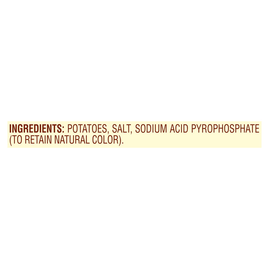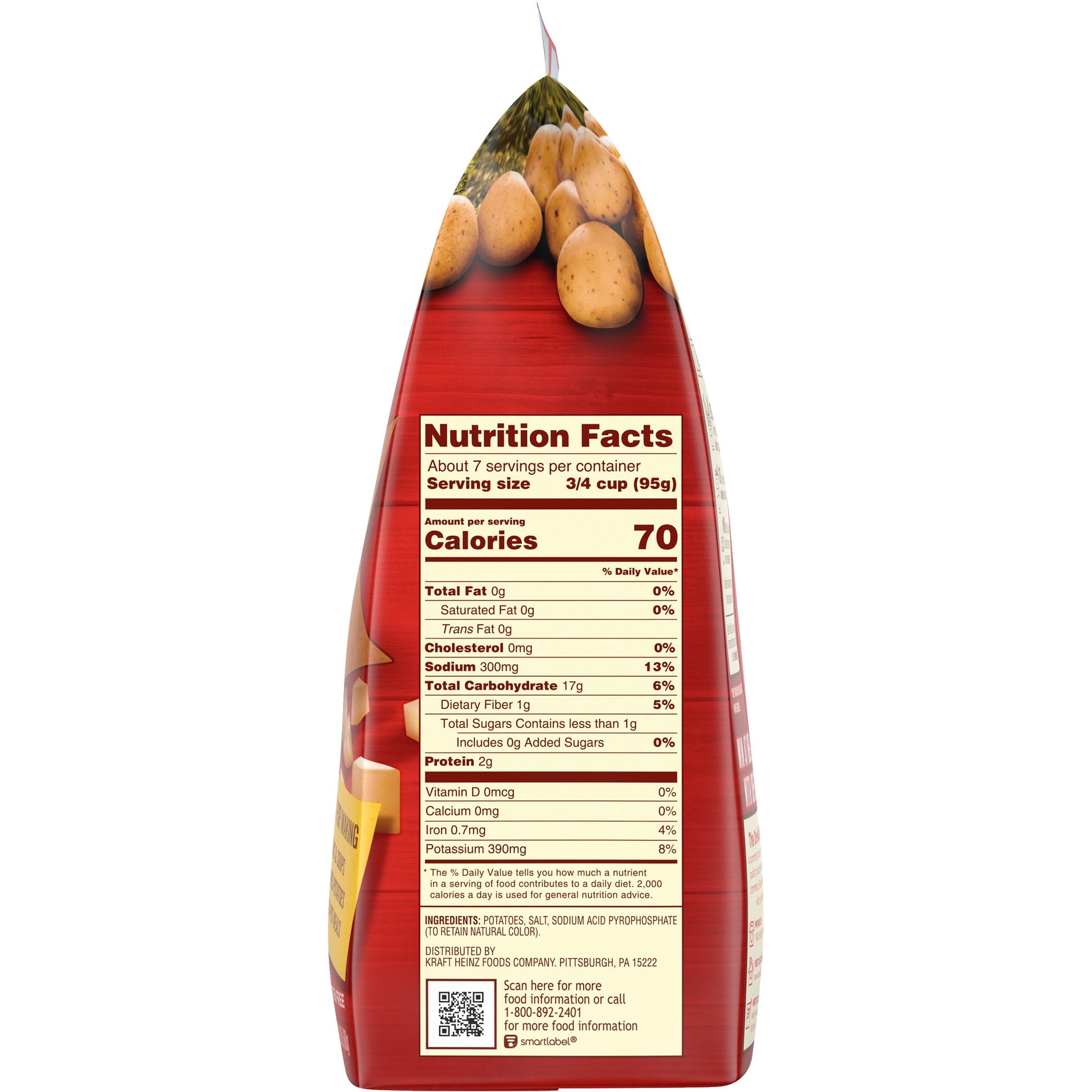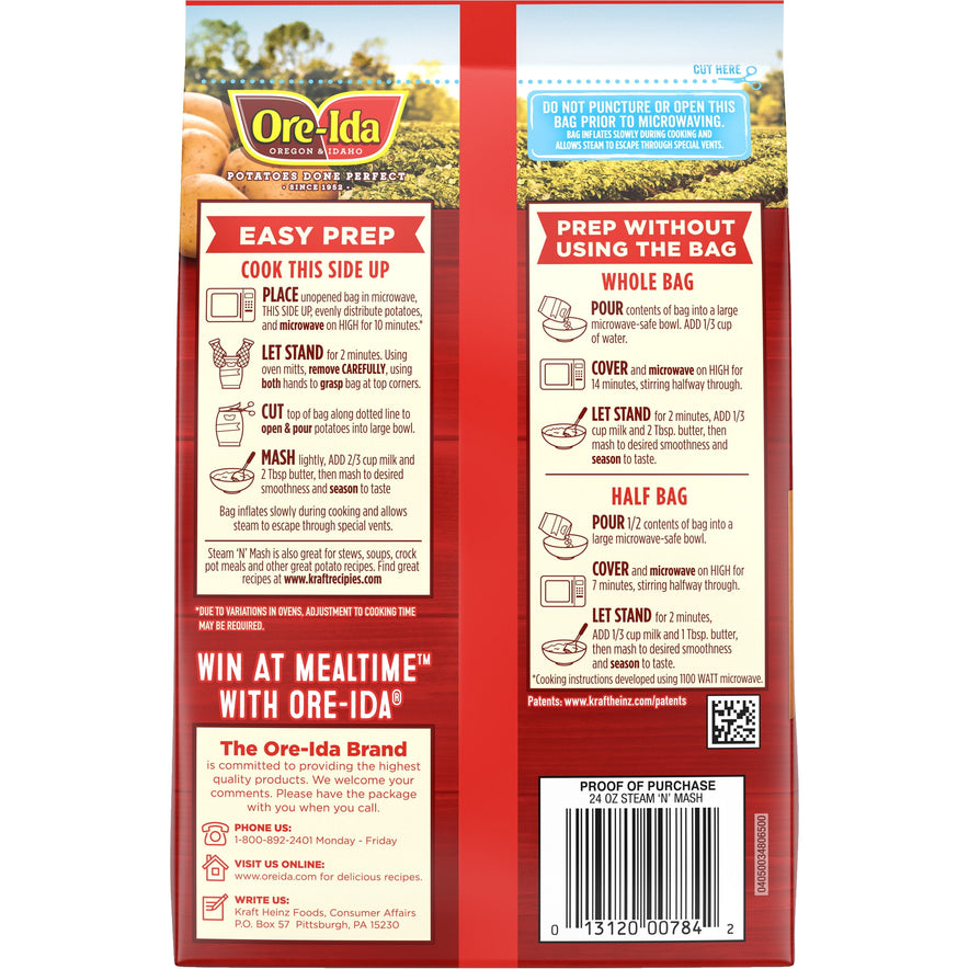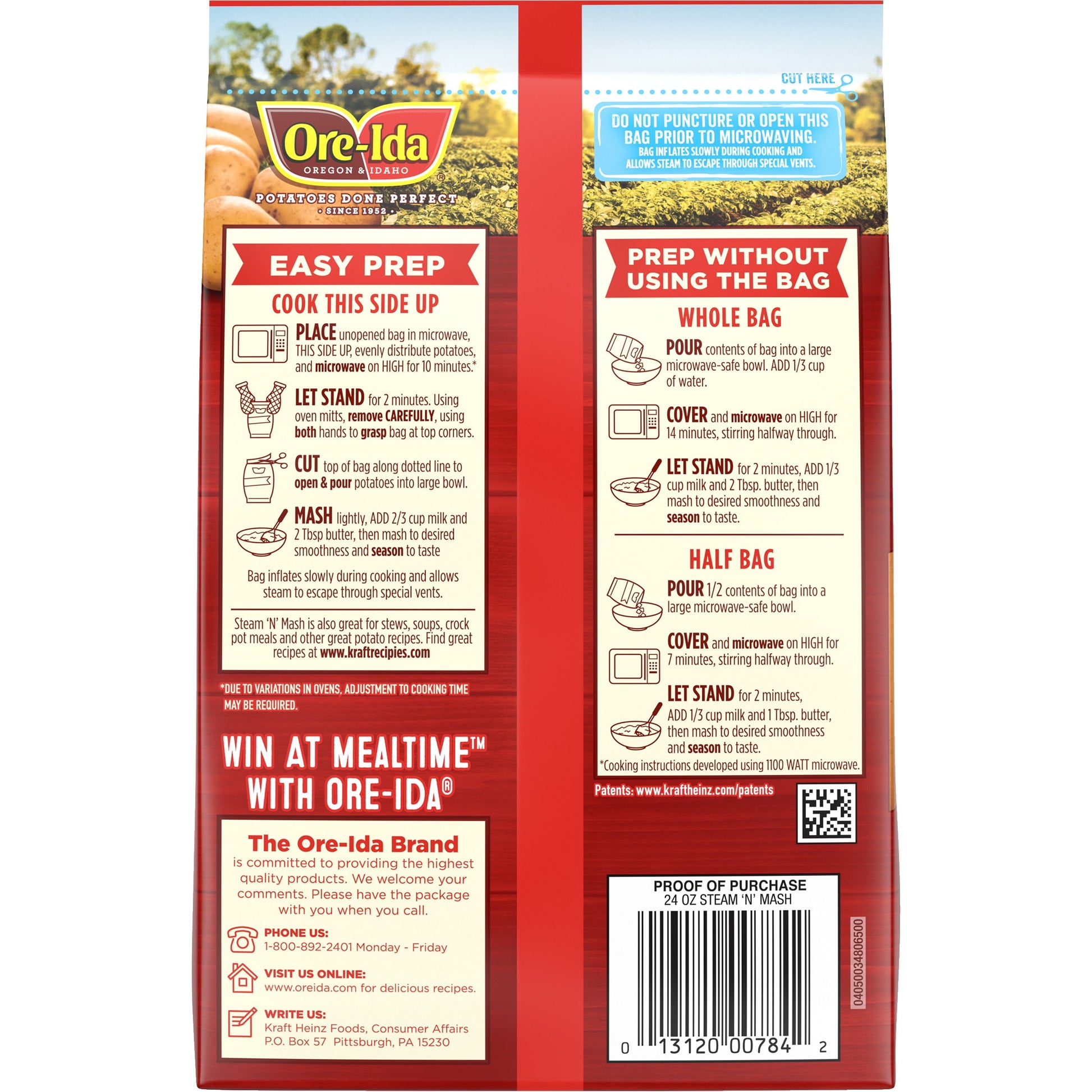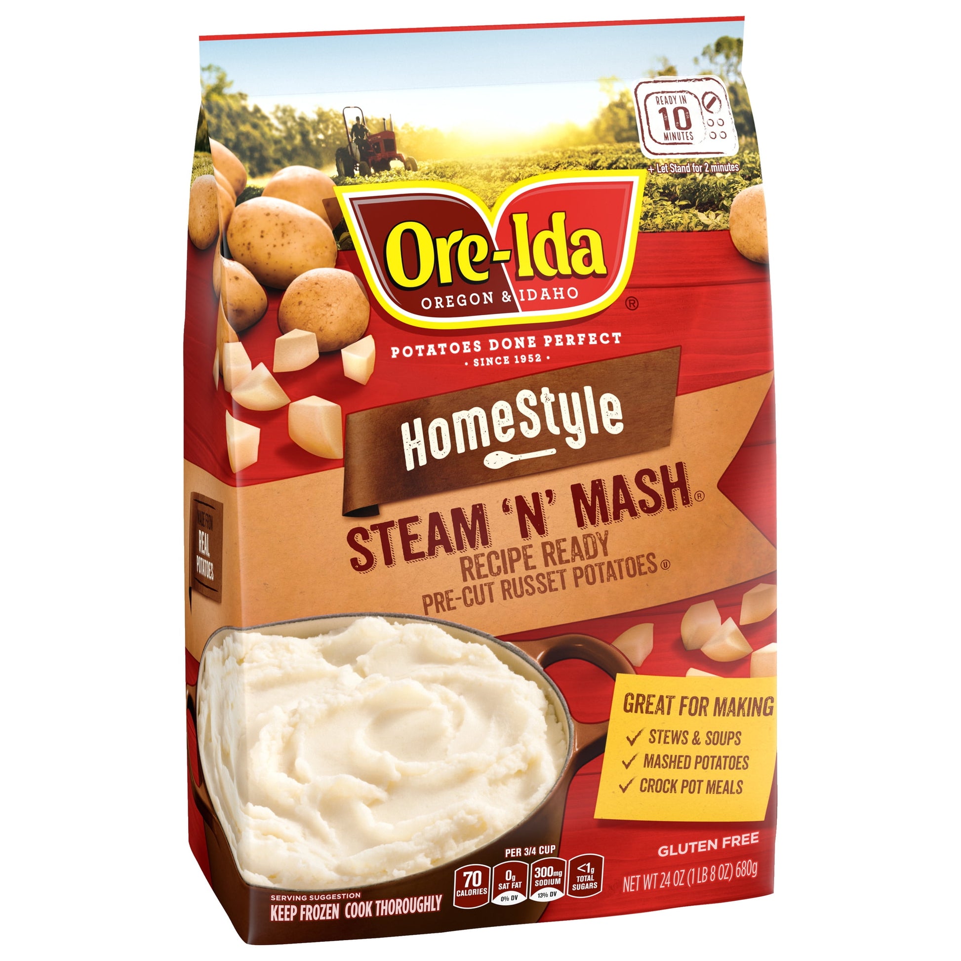 Ore-Ida Homestyle Steam N' Mash Recipe Ready Pre-Cut Russet Potatoes give you a new, easy way to enjoy the potatoes your family loves. Made from freshly peeled, American grown potatoes, these pre-cut multi use russet potatoes are recipe ready for home style flavor without the work. These potatoes are gluten free and offer a versatile recipe ingredient for everything from mashed potatoes to potato soup. Simple to prepare, these steamed potatoes heat easily in the bag in 10 minutes in the microwave. Ore-Ida Homestyle Steam N' Mash Recipe Ready Pre-Cut Russet Potatoes come sealed in a 24 ounce bag for easy storage in the freezer. Your family deserves the highest quality.