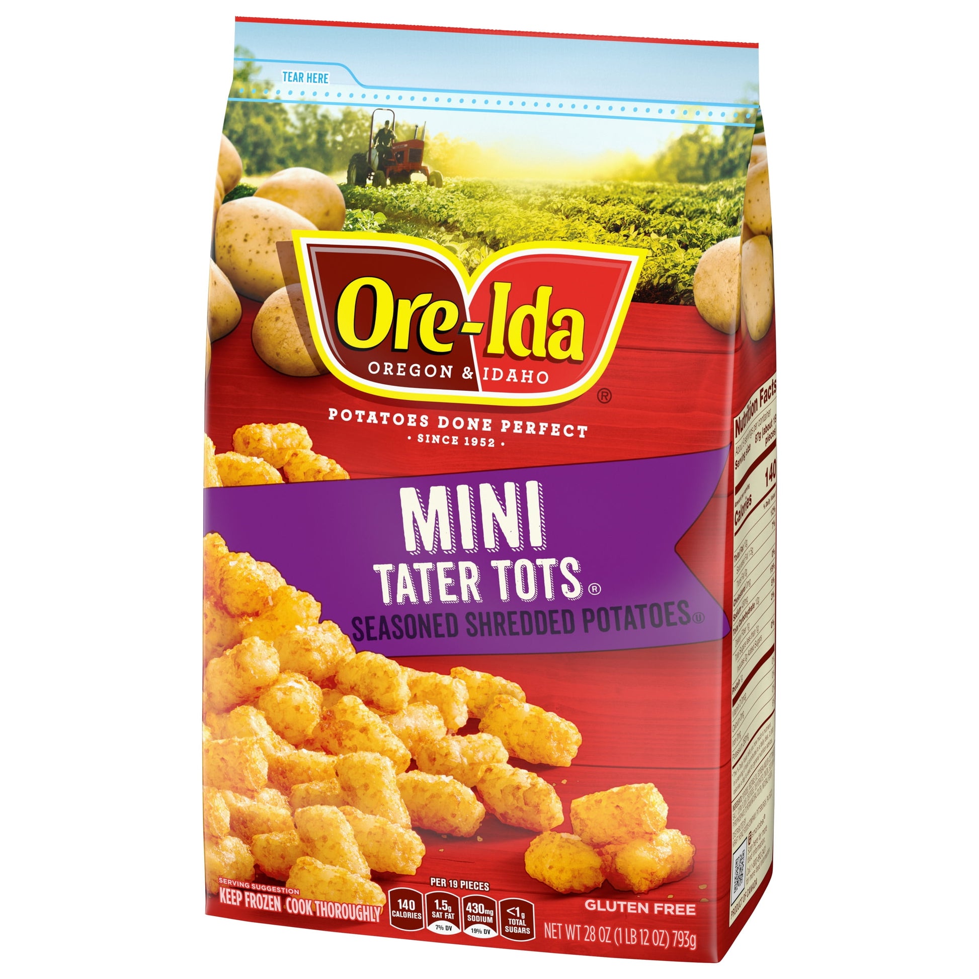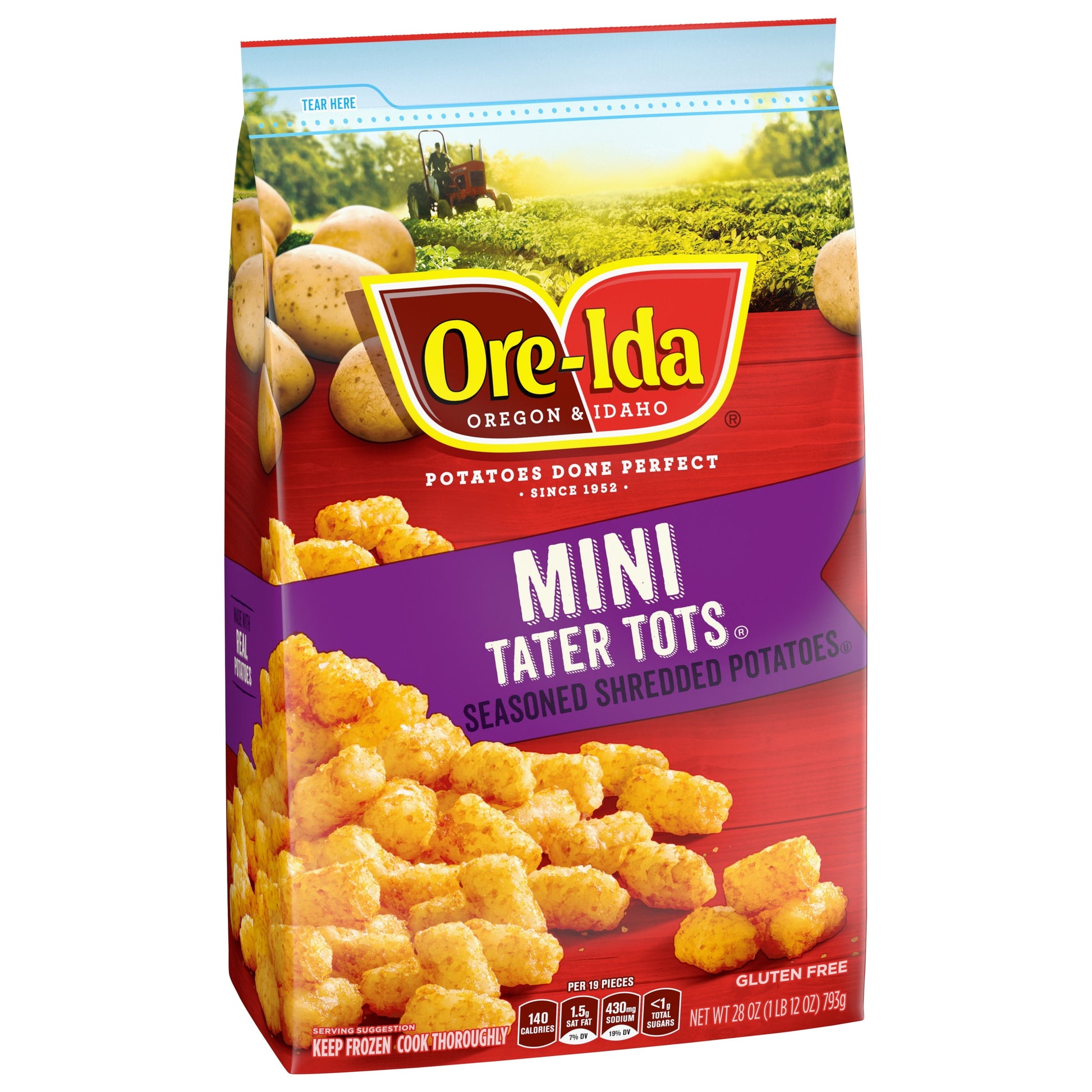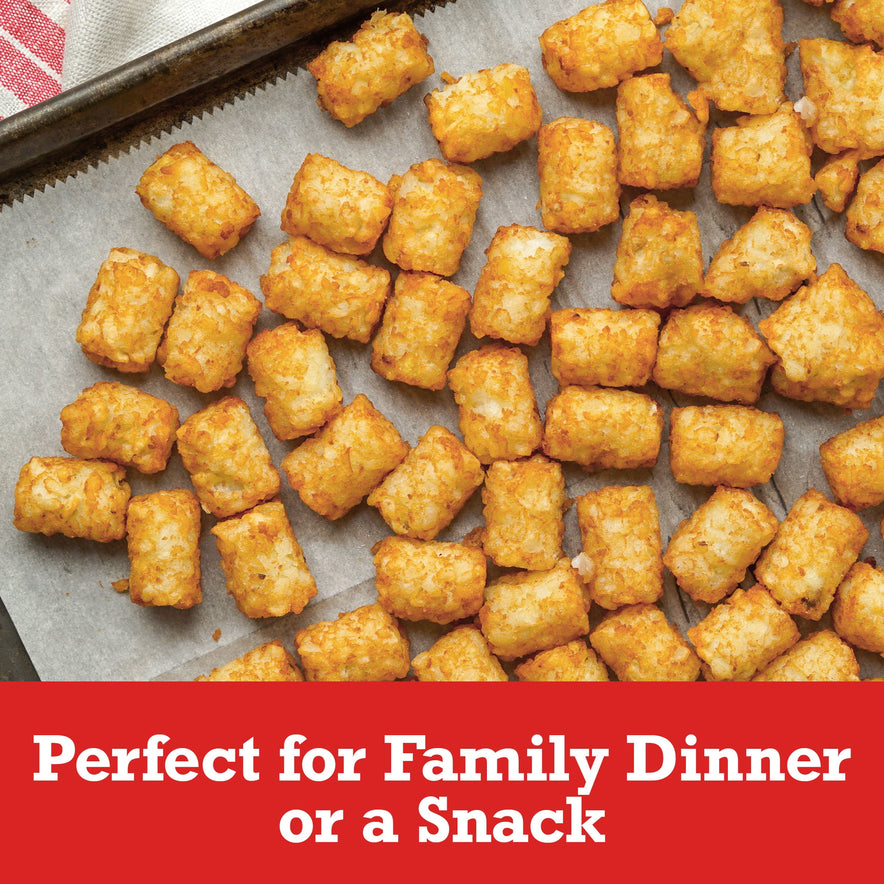 Ore-Ida Mini TATER TOT potatoes make it easy to enjoy a quick, easy potato side dish at home. Crispy and golden, these mini tots are made from freshly peeled, American grown potatoes that are shredded and seasoned. These gluten free frozen tots offer a crispy outside with a soft inside for the perfect blend of textures to make your next family meal a success. Toss TATER TOTS potatoes on a baking sheet to cook them in the oven according to package instructions for perfectly crispy results. A classic potato option, these oven baked tots are perfect as a side dish or in a casserole. TATER TOTS potatoes come sealed in a 28 ounce bag to help lock in flavor. Your family deserves the highest quality.