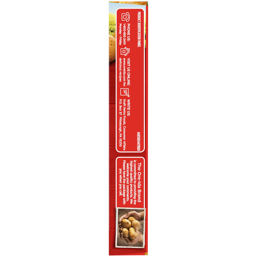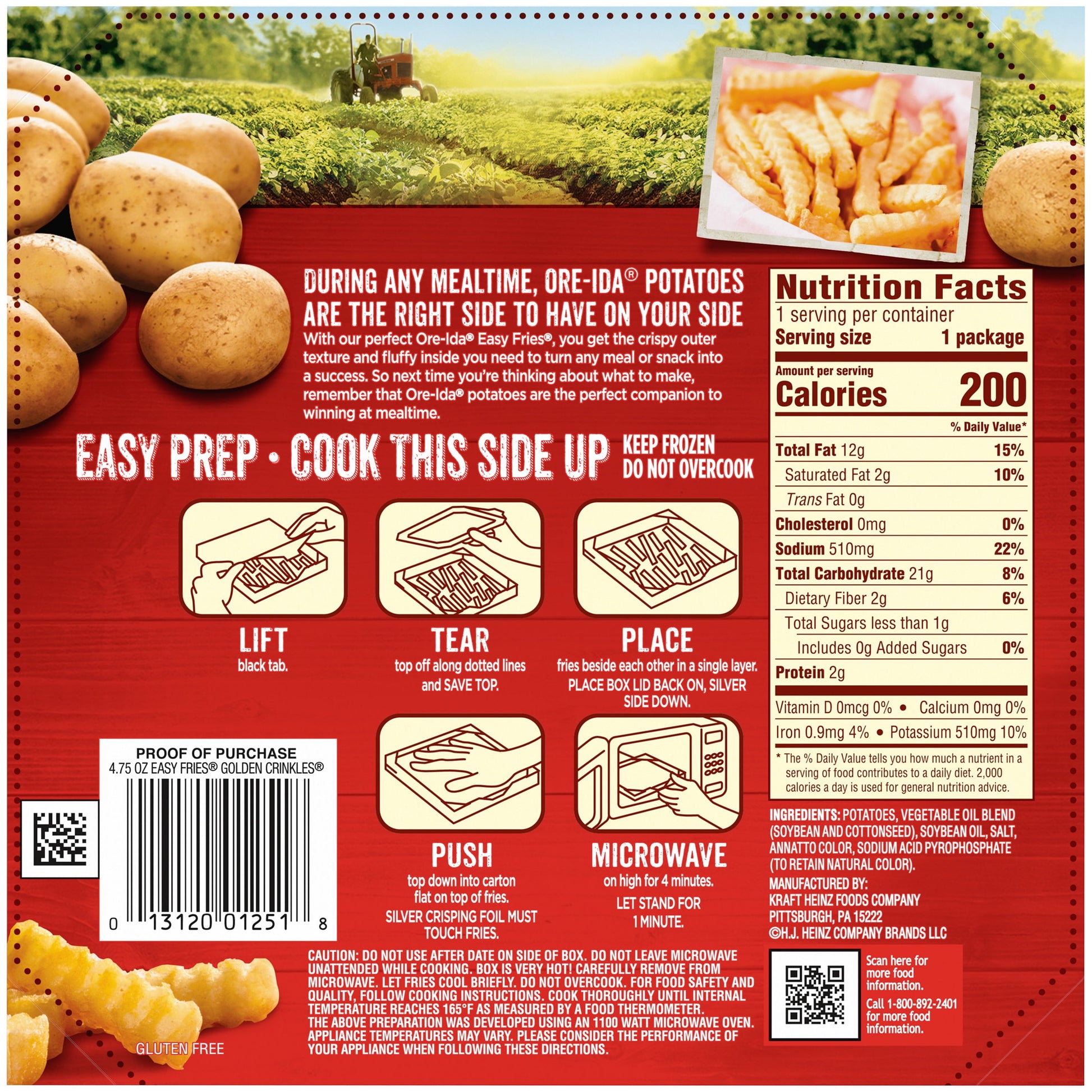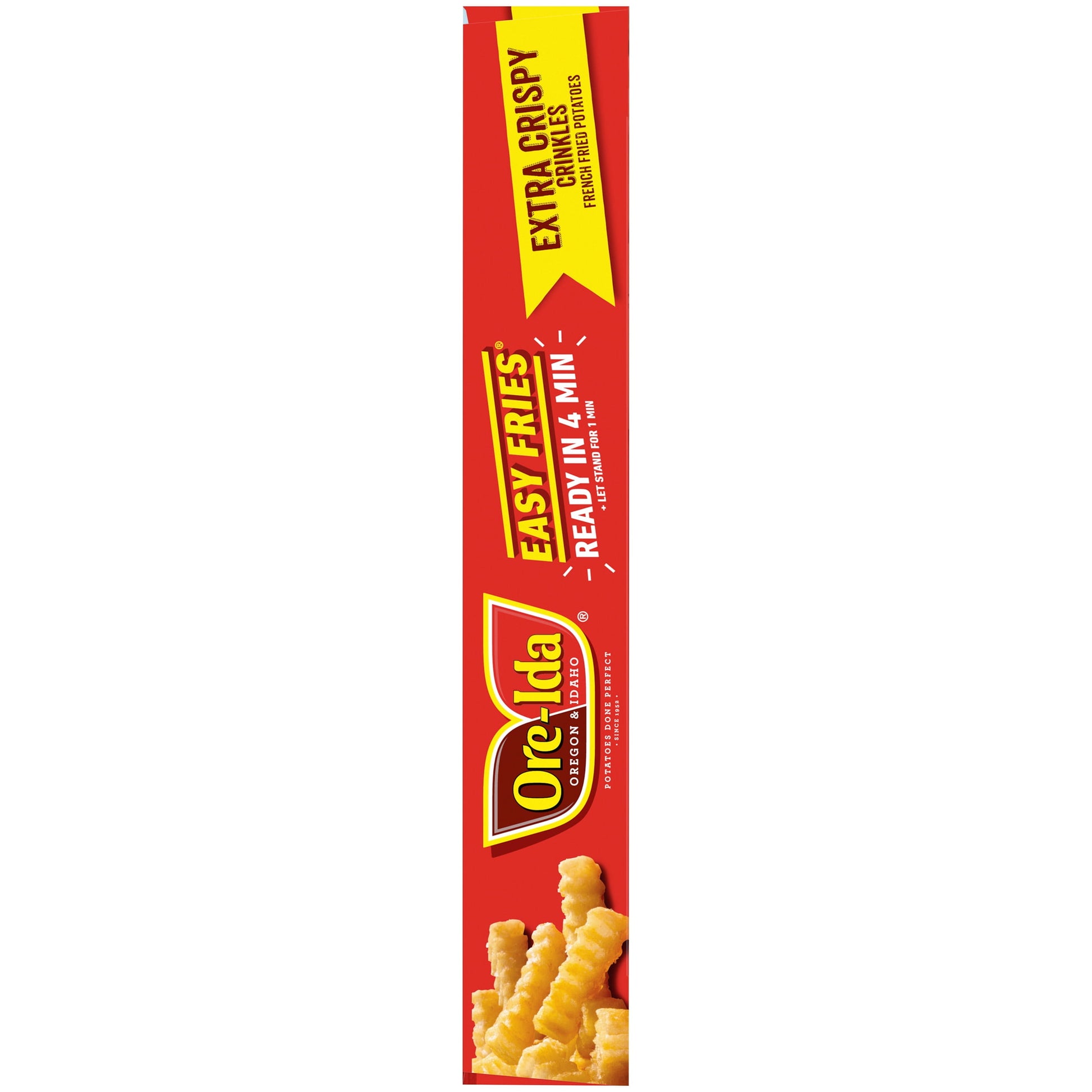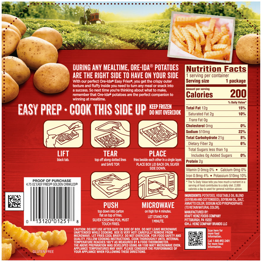 Ore-Ida Ready in 5 Extra Crispy Crinkles Fries make it easy to enjoy delicious fries from the microwave. Crispy and golden, these Grade A microwave fries are made from freshly peeled, American grown potatoes. These gluten free crinkle fries are deliciously crispy on the outside and light and tender on the inside for the perfect blend of textures to make your next family meal a success. With specially prepared Ore-Ida Golden Crinkles tucked between an upper and lower crisping sheet, the packaging lets the heat from your microwave cook them to crispy perfection in just four minutes. An American classic, these frozen French fries are the perfect quick snack or side dish. Serve up the traditional burger and fries, or get creative with loaded fries topped with cheese and bacon. These fries come packaged in a 4.75 ounce box for easy freezer storage. Your family deserves the highest quality because if it's not Grade A, it's not Ore-Ida!