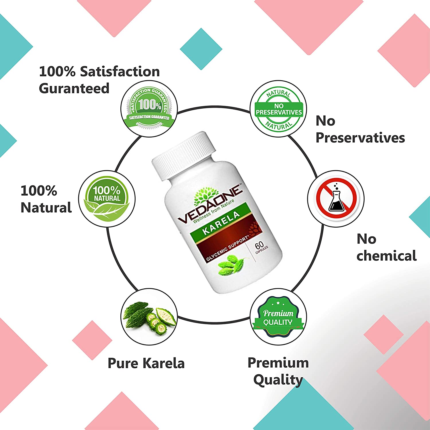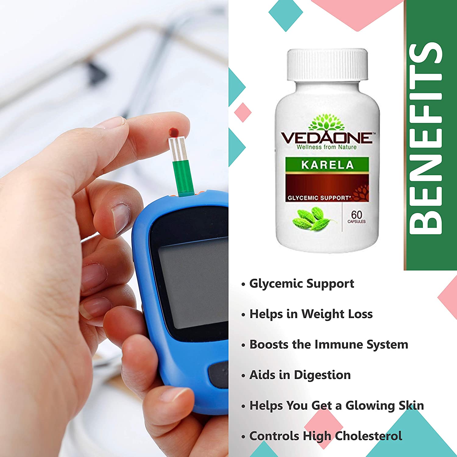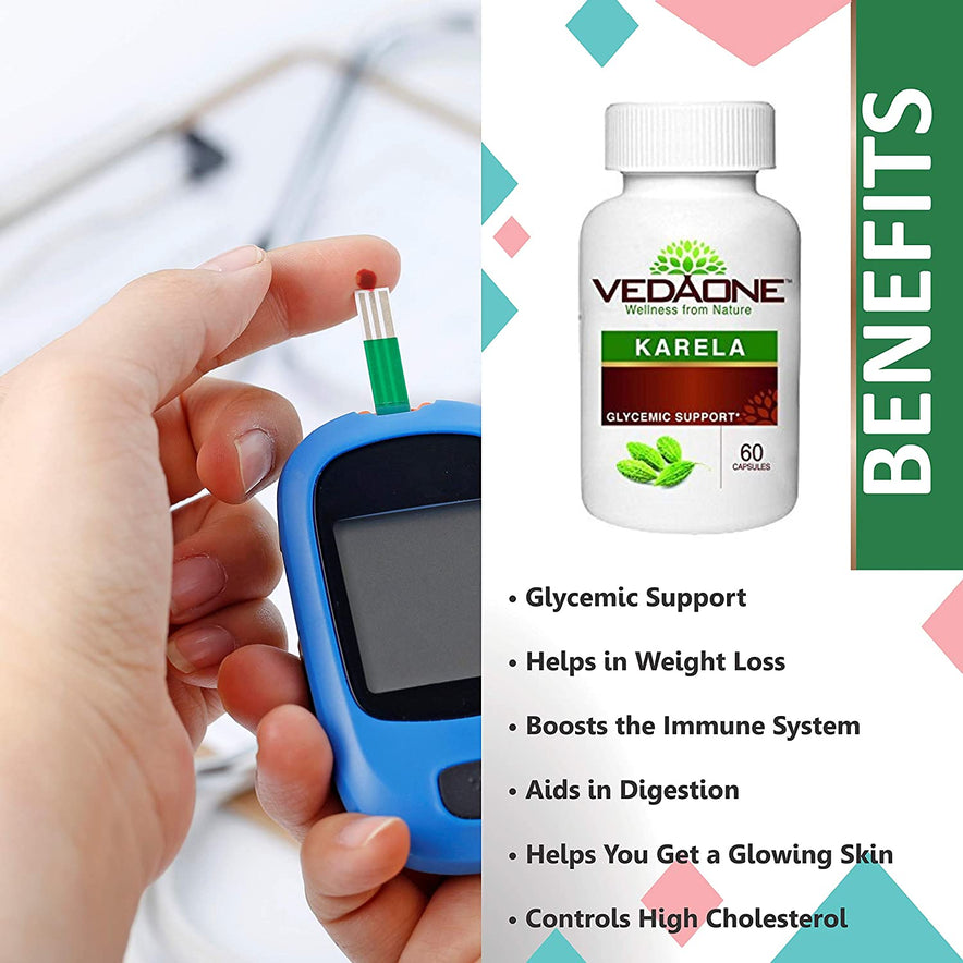 Vedaone Karela Capsules is Ayurvedic Medicines. It helps to reduce blood sugar levels.It helps maintain healthy glucose levels. It promotes healthy glucose utilization by the body’s tissues. Antioxidant properties help scavenge cell-damaging effects of free radicals and reduce the risk of glucose instability complications.