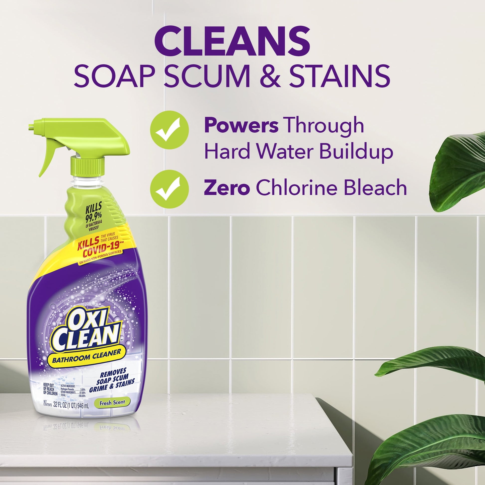 Got tough bathroom stains? OxiClean Bathroom Cleaner is a powerful cleaner designed to tackle your bathroom's toughest stains. The chlorine bleach-free formula uses the power of oxygen and stain-fighting bubbles to penetrate and remove gunk and grime. Use it as a tile cleaner and tub cleaner to power through soap scum, hard water buildup, and calcium and lime stains. Kills 99.9% of bacteria and viruses when used as directed. Use on surfaces such as showers, glass doors, glazed tile and porcelain, chrome and stainless steel, sinks, tubs, grout, and plastic laminate. Use for a fresh-scented bathroom.