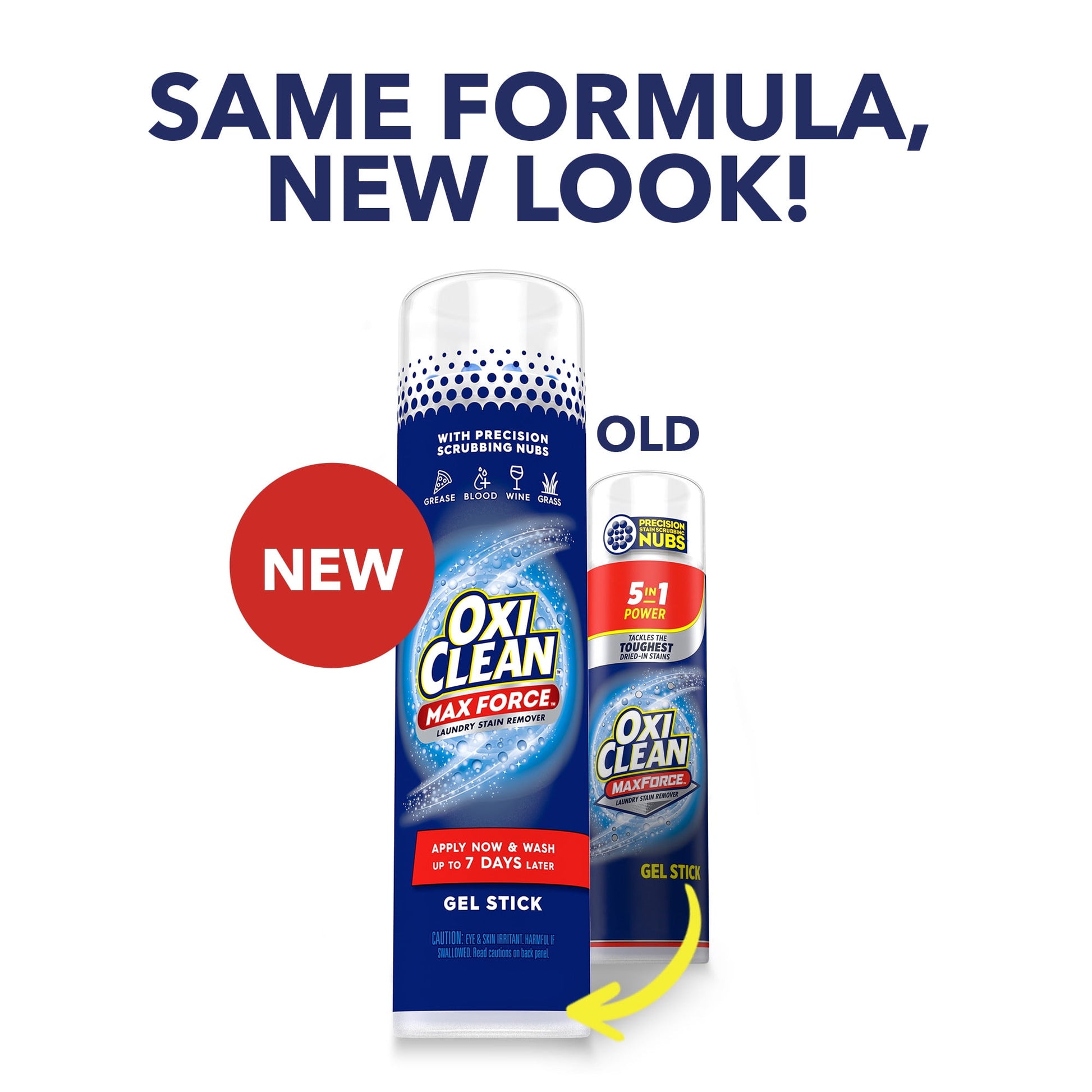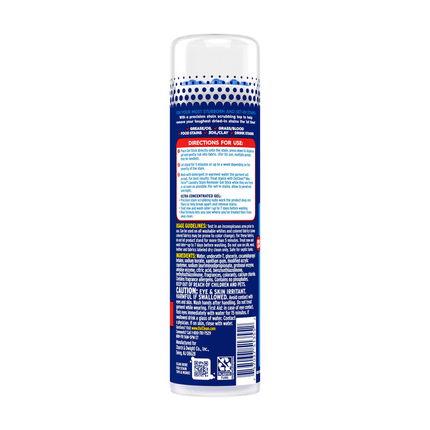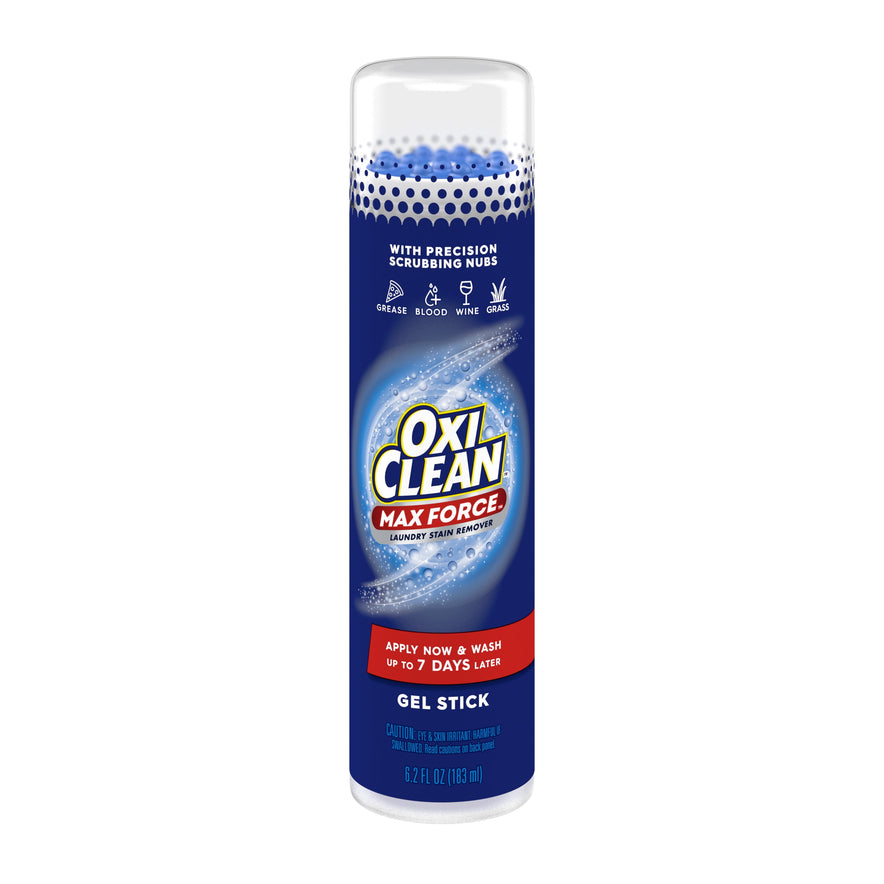 Harness the power of oxygen to remove tough dried-in stains with OxiClean Max Force Laundry Stain Remover Gel Stick. OxiClean Max Force laundry spot remover gel lets you do laundry on your schedule—apply and wait five minutes or up to seven days before washing. The ultra-concentrated gel uses precision stain-scrubbing nubs to penetrate deep into clothing fibers to break apart and help remove tough, set-in stains the first time—like grass, oil, grease, food, wine, dirt, ink, blood, makeup, and kids’ and baby stains. Use this chlorine-free, color-safe, dye-free stain remover for laundry on all machine-washable white and colored clothing, sheets, towels, and more. Help keep white canvas shoes white, remove pizza grease from your favorite shirt, and as a stain remover for baby clothes and kids’ hand-me-downs. Rub this clothing stain remover gel directly on stains until saturated, let stand for five minutes, or up to seven days, then wash in the warmest water the fabric will accept. For best results, pretreat stains with this laundry spot remover as soon as possible. Keep the convenient 6.2 fl oz gel stick around your home so you‘re ready for life's messes. From stain removers and laundry boosters to household cleaners and much more, OxiClean offers a product to fit your needs.