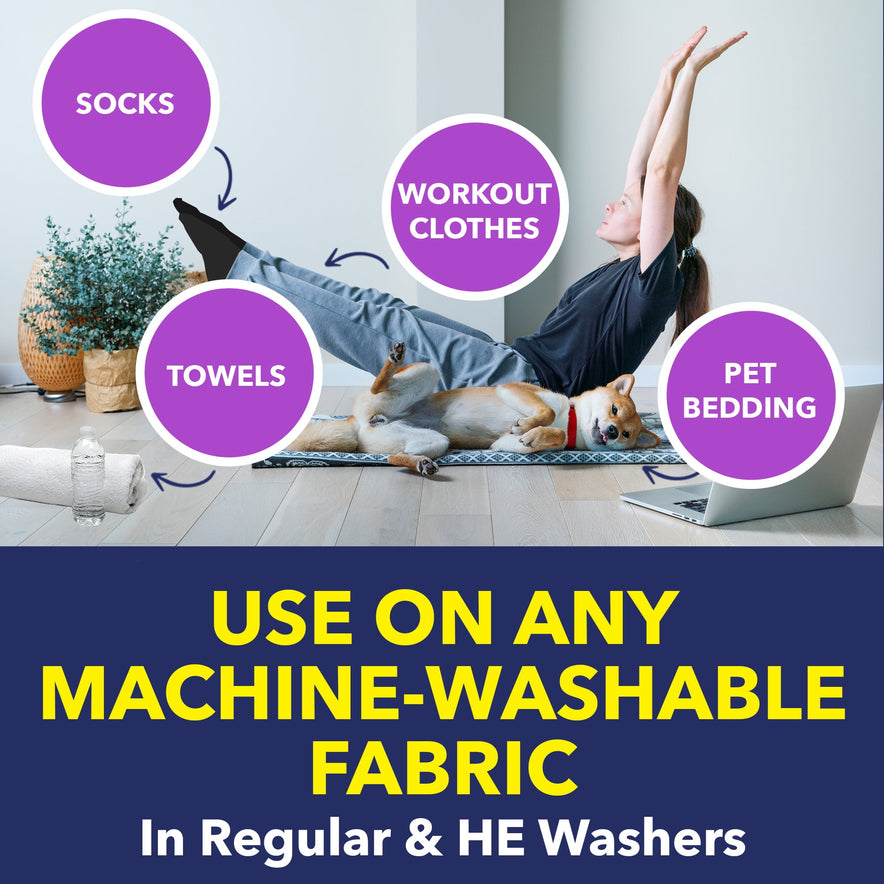 Liquid laundry booster works with regular detergent in HE or standard washers as a laundry stain remover and odor neutralizer for machine-washable clothing, sheets, towels, workout clothes, shoes, team uniforms, and pet bedding